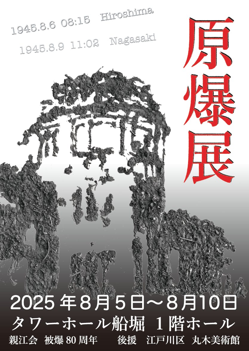 2025/07/31 14:098/5(火)〜8/10(日) タワーホール船堀にて被爆80年「原爆展」を開催します(入場無料)。主催は東京都江戸川区の原爆被害者の会「親江会」実は私、ここの参与会員理事をしています。そのきっかけは、3年前の「戦争の記憶と記録を語り継ぐ映画祭」でした。その中で親江会会長の山本宏さんが、7才の時に被爆した時の証言を拝聴する機会がありました。お話の最後に、山本会長が詩吟「原爆行」を披露してくださったのですが、その声に心を揺さぶられて生まれたのが、文画「原爆行」でした。この作品は、2022年12月に東京都美術館で開催された「第50回記念國際書道連盟展」で秀作賞を受賞しました。私が山本会長にこの吉報を伝えたところ、わざわざ会場まで足を運んで下さいました(下の画像はそのときの写真)。https://ganicalligraphy.tokyo/2022/12/15/ganbakukou/そこから山本会長とのお付き合いが始まり、現在に至ります。原爆投下から今年で80年、あの戦争を生き延びた人も年々少なくなっています。同様に、親江会の会員も年々減少しています。あの戦争を生き延びた人がこの地球上から居なくなってしまうのも時間の問題です。この「被爆80年」といいう節目の年、そして昨年は上部団体の日本原水爆被害者団体協議会(略称:被団協)がノーベル平和賞を受賞しました。このタイミングで開催する今回の「原爆展」に向けて、我々会員はかなり力を入れて準備をしており、様々な作品展示や催し物を用意しております(全部無料です!)。・丸木位里・俊 夫妻の「原爆の図」第一部〜第八部・広島市立基町高校生徒と被爆者の「原爆の絵」・映画上映(一部トークあり)「黒い雨」「ヒロシマへの誓い サーロー節子とともに」「お母さんの被爆ピアノ」「ある家族の肖像 〜被爆三世代の証言」「サイレントフォールアウト」「広島・長崎における原子爆弾の影響」・古今亭菊太楼さんの新作落語「母のお守り」・アーサー・ビナードさんの紙芝居と講演その他、原爆被害者の証言等も耳にすることができる貴重な機会となります(拙作「原爆行」やポスター原画等も展示します。私も会場におります)。被爆80年「原爆展」8/5(火)〜8/10(日) タワーホール船堀にてhttps://ganicalligraphy.tokyo/2025/07/27/genbakuten/皆様のお越しをお待ちしております! もっと見る