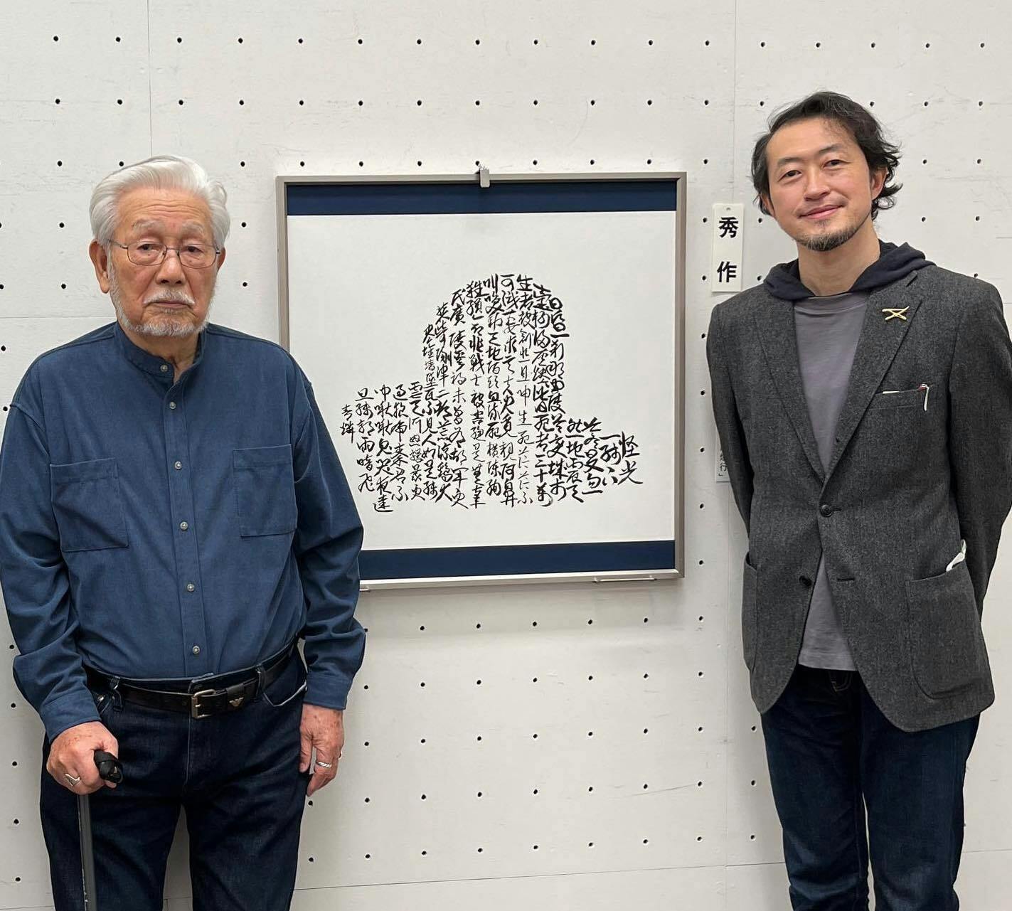 この作品は、2022年12月に東京都美術館で開催された「第50回記念國際書道連盟展」で秀作賞を受賞しました。私が山本会長にこの吉報を伝えたところ、わざわざ会場まで足を運んで下さいました(下の画像はそのときの写真)。