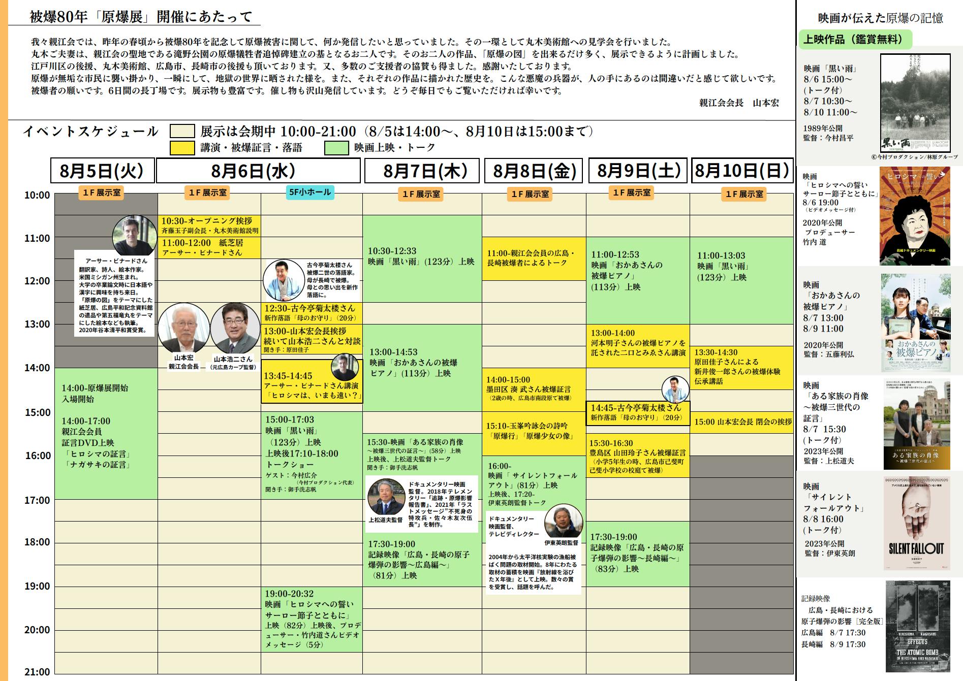 ・映画上映(一部トークあり)「黒い雨」「ヒロシマへの誓い サーロー節子とともに」「お母さんの被爆ピアノ」「ある家族の肖像 〜被爆三世代の証言」「サイレントフォールアウト」「広島・長崎における原子爆弾の影響」