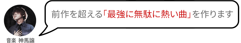前作でも「無駄に熱い曲でなぜか感動した!」など好評の声を多くいただきました。今作でも、前作に負けない胸熱な楽曲をみなさんにお届けすることをお約束します!