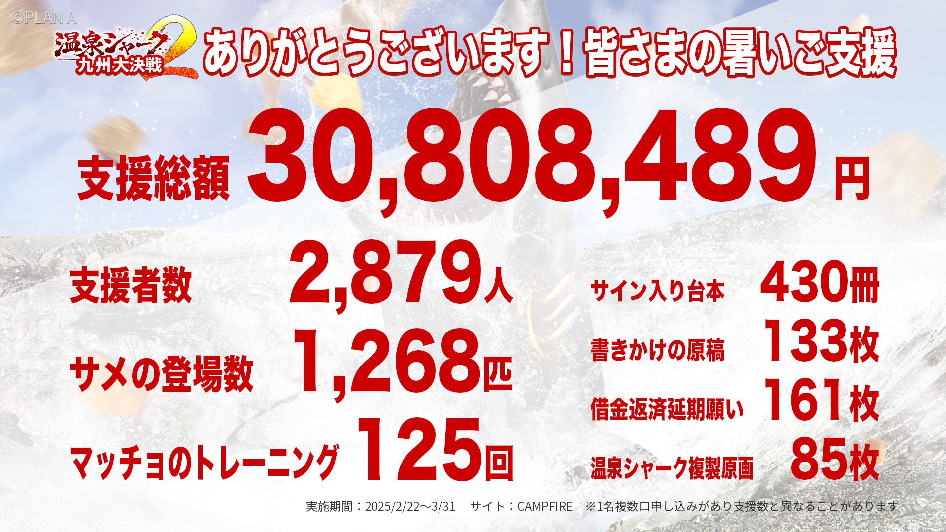 2025年2月22日よりスタートいたしました映画『温泉シャーク2 九州大決戦(仮称)』のクラウドファンディングは、3月31日23時59分をもちまして、無事に終了いたしました。