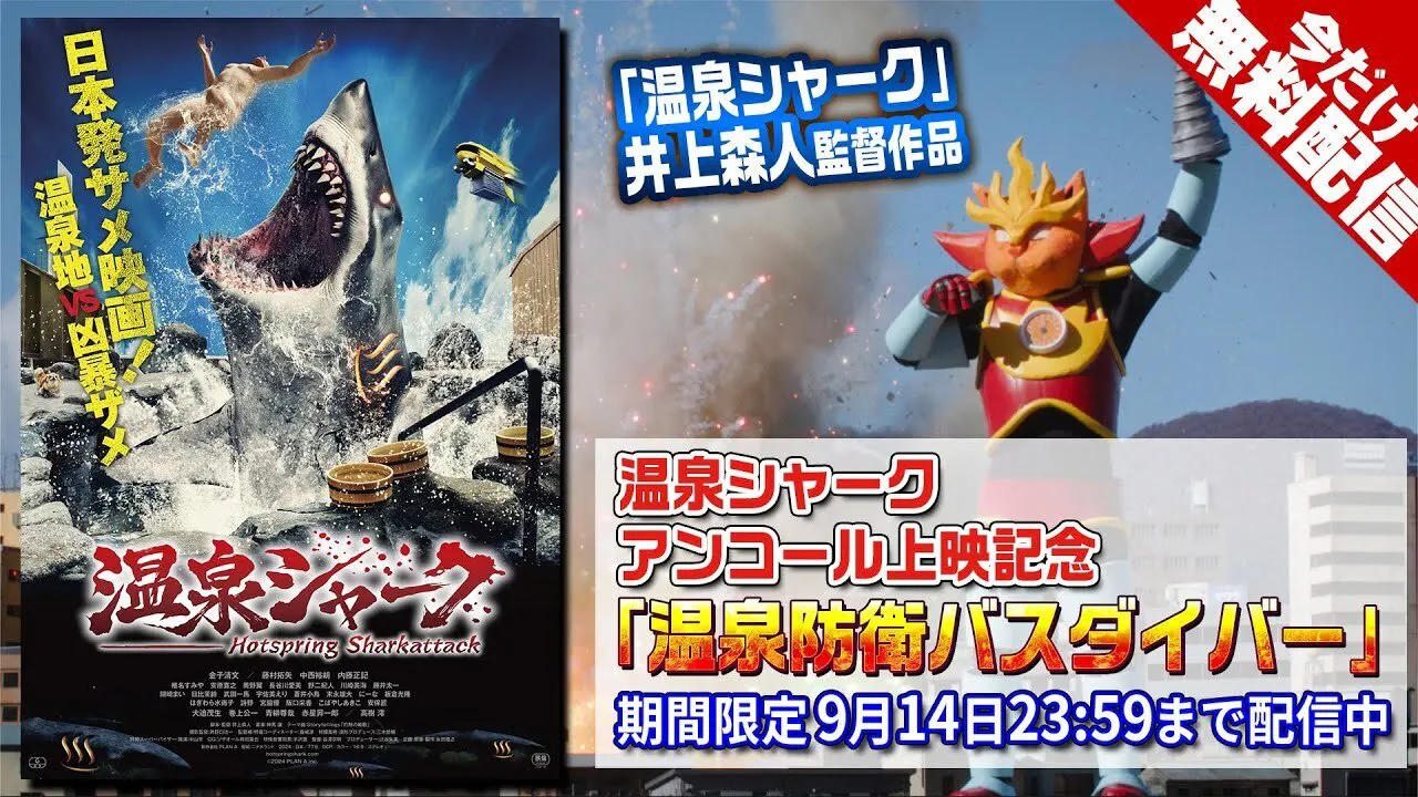 井上森人監督による短編映画『温泉防衛バスダイバー』を、YouTubeにて 温泉シャークのアンコール上映を記念して2週間限定無料公開します。暑海市に迫る新たな危機に、市長・貫一が立ち向かう姿をぜひお楽しみください。