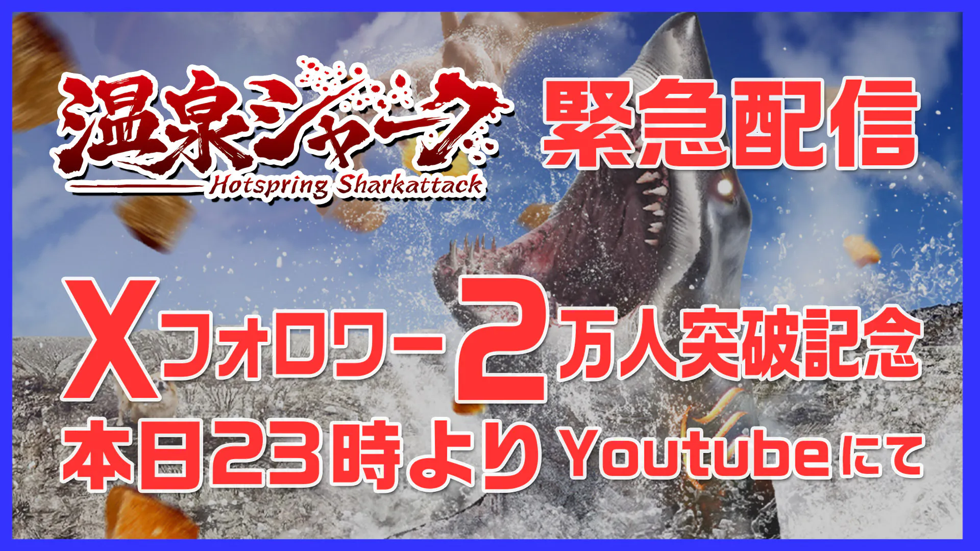 おかげさまで『温泉シャーク』公式Xのフォロワーが2万人を突破いたしました。 これを記念し、本日12月12日(金) 23:00より、緊急YouTubeライブを行います。
