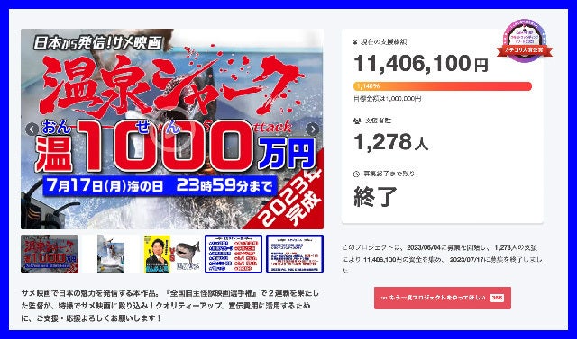 2023年6月、クラウドファンディングで1278人から支援を集めて破竹の勢でスタートした映画制作プロジェクト『温泉シャーク』。