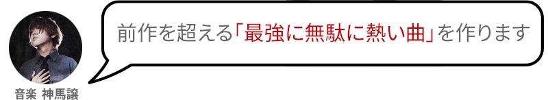 前作でも「無駄に熱い曲でなぜか感動した!」など好評の声を多くいただきました。今作でも、前作に負けない胸熱な楽曲をみなさんにお届けすることをお約束します!