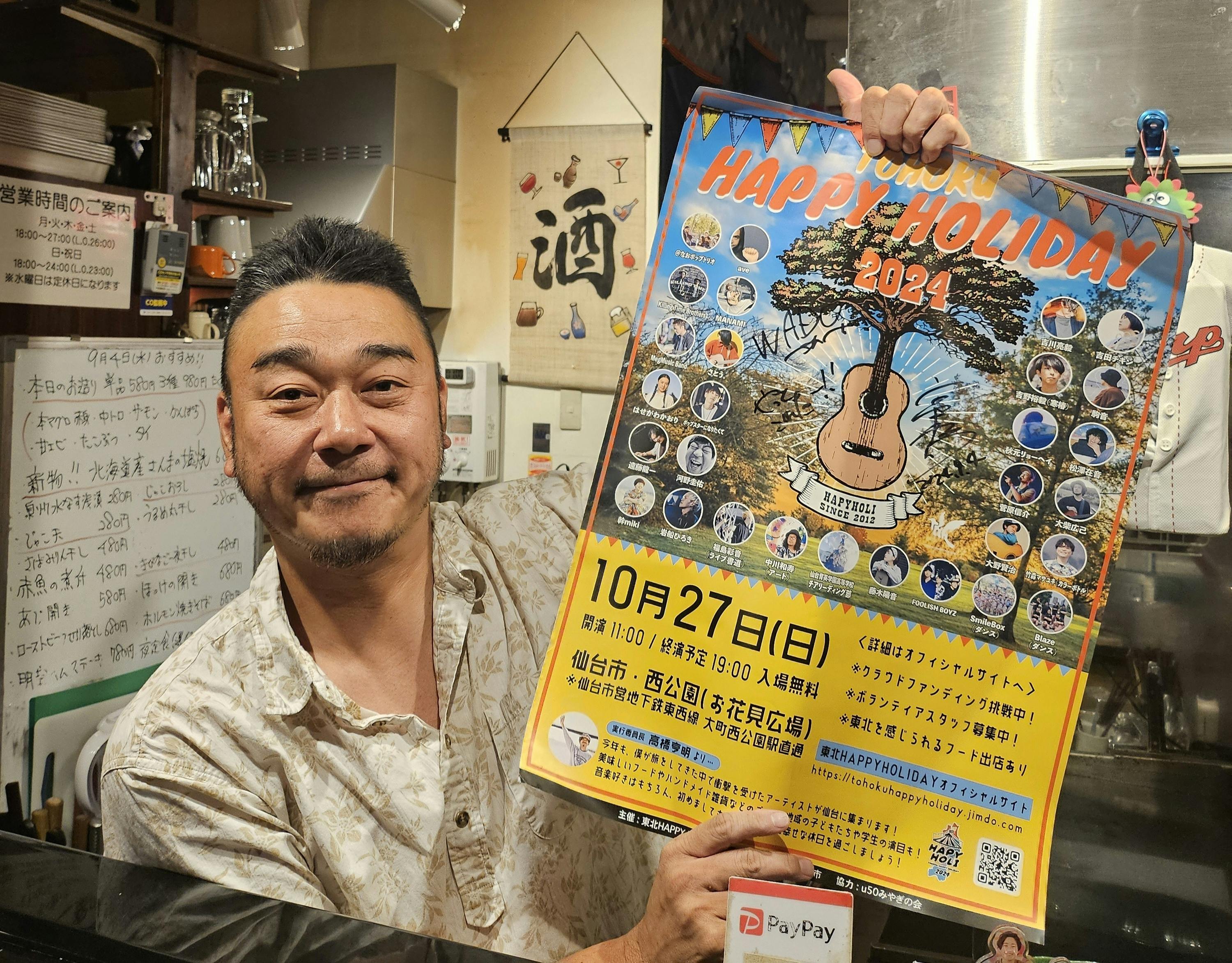 そんな中、ハピホリ2024のポスターも持ってきてまして、本日の会場「伊丹WADO」さんに一枚目を貼っていただきました!