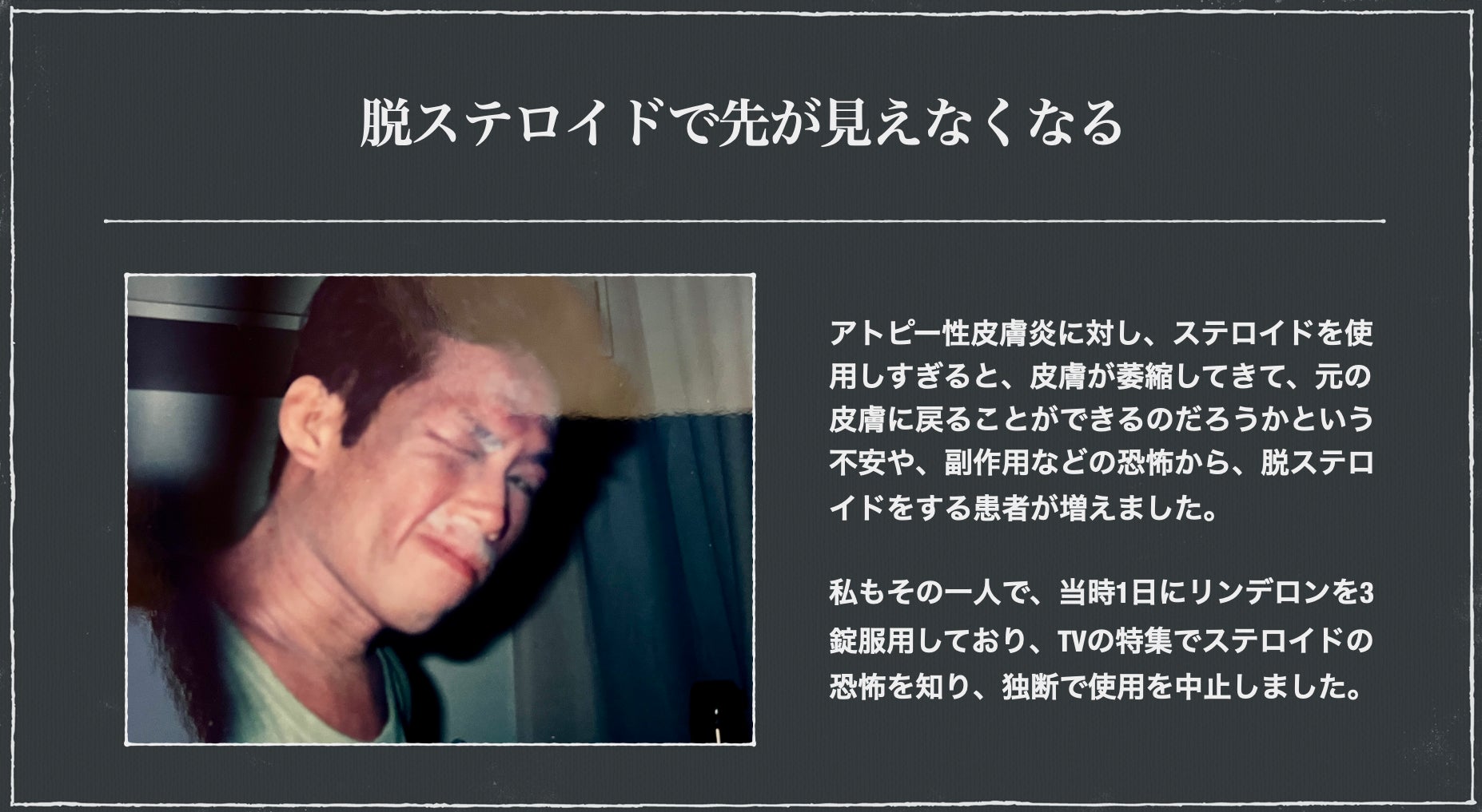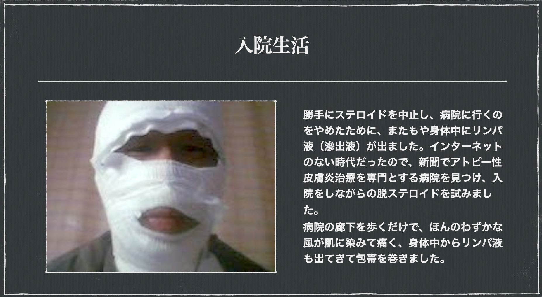 顔中がパキパキと割れて、なす術もなく、自宅にあったベビーオイルを塗りたくる始末。やがて、痒みが全身に達し、身体中にリンパ液(滲出液)が出て、お風呂から上がると、のたうちまわるほどの痛みに襲われたりもしました。