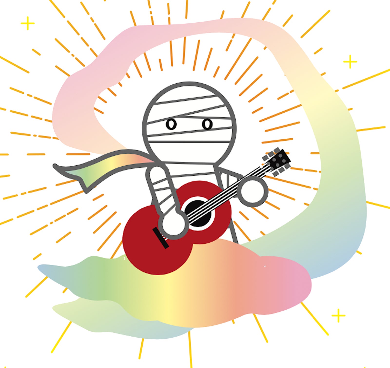 「まるで夢に向かう虹色の雲で表現しました」「包帯でまかれていた時、ギターを持つことで夢に向かっていたのかな。その時間があったから夢につながったのかな。そう考えると包帯は夢につながるかけはしのようなリボンだったのかな…そんなイメージがひろがりました」(デザイナー談)