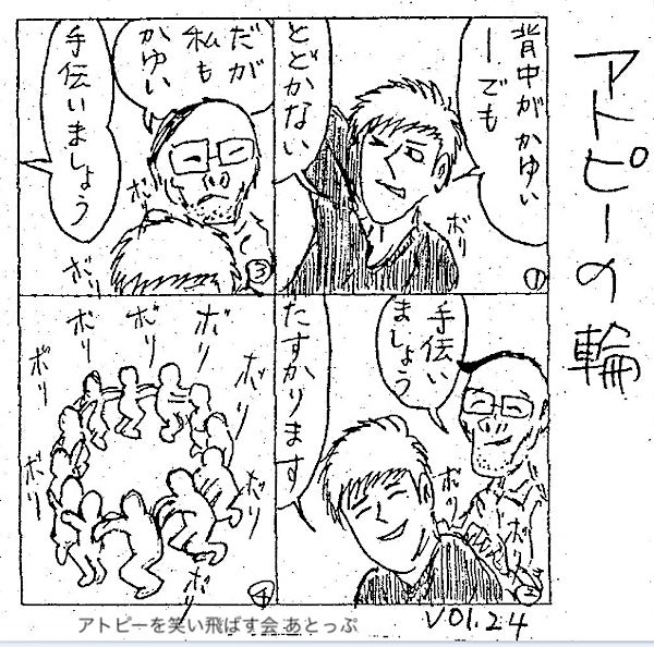 アトピー患者は痒く痛く苦しくても、仲間がいれば乗り越えることのできる病気だと気づきあったものです。そんなことがご縁で、「アトピーを笑い飛ばす会『あとっぷ』」を立ち上げ、会員さんは多い時で170名くらいになりました。