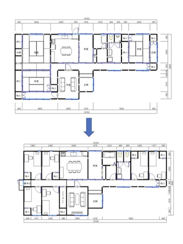 定員6名のファミリーホームを営むために、まず築45年の庭・離れつき平屋(敷地面積約500平米)を2024年購入。和室3部屋を改築し、児童の個室として6部屋を確保します。それに伴い、間仕切りや壁を補修することになり、耐震性の増加が期待できます。また、それぞれ机、ベッド、エアコン、クローゼットが完備される予定です。また、改修しない部分は、職員の宿直室や皆が集うリビングルームに転用します。