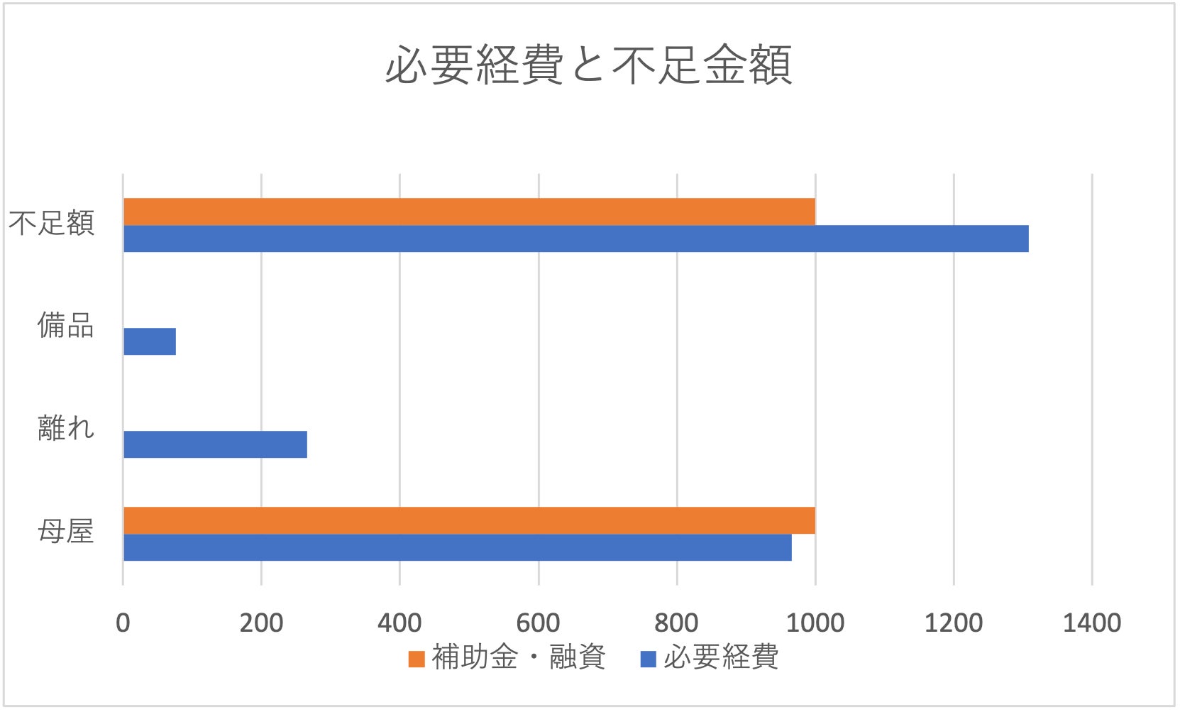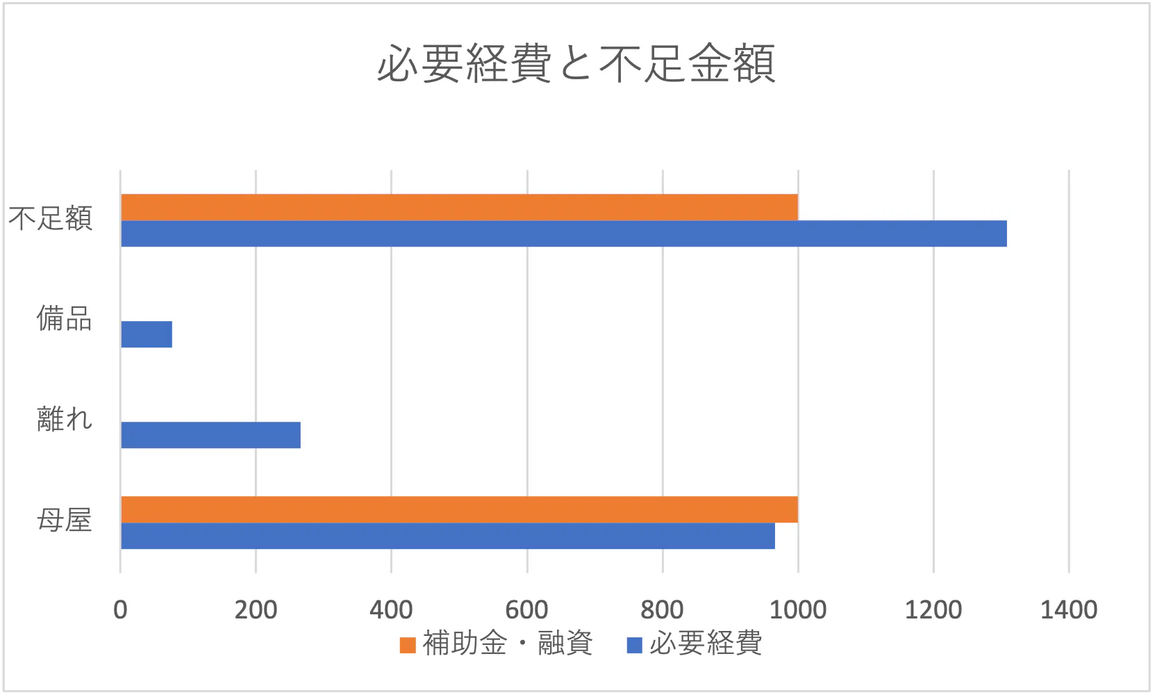 母屋と離れの施設改修費及び備品代は、総額約1,300万円。これに対し、県の補助金と公庫融資計1,000万円の交付が決定していますが、これまで説明したような設備をそろえるには計300万円ほど足りていないのです。(下グラフ参照)