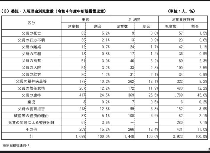 ちょっと見づらいですが、里親への委託で一番多いのが、父母の虐待、次いで養育拒否、そして放任怠惰となっています。