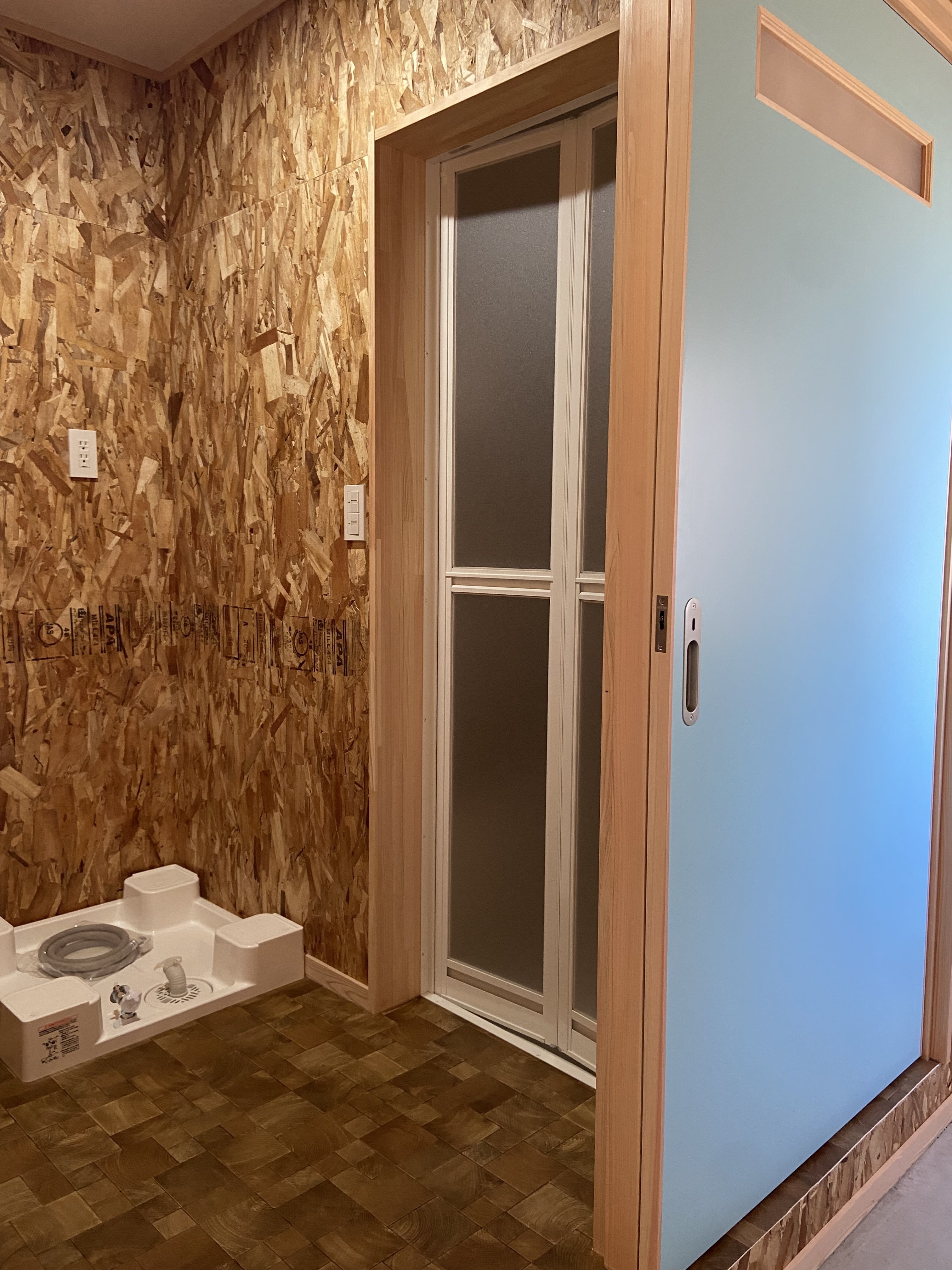 さて、本日の写真は離れの脱衣場の入り口ドア。明かり窓もつけて頂きました。やっぱり可愛い♡