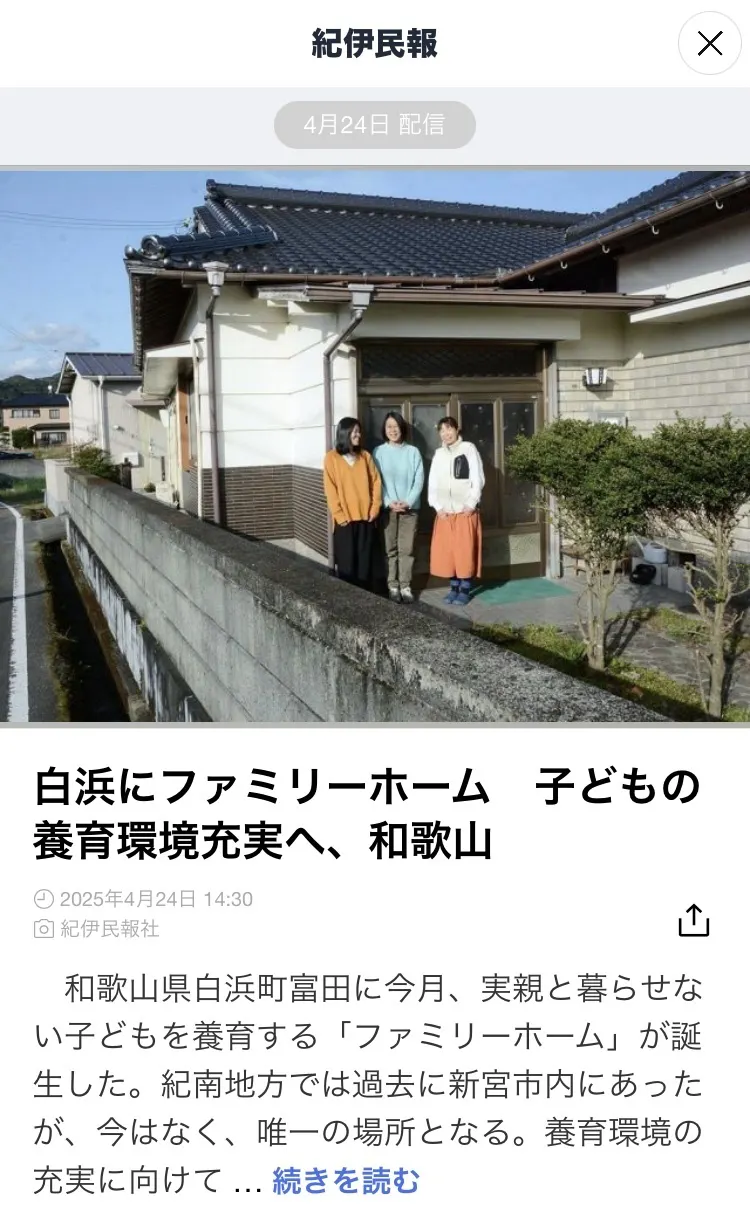 白浜にファミリーホーム 子どもの養育環境充実へ、和歌山(紀伊民報) https://u.lin.ee/10zz5Ck?mediadetail=1&utm_source=line&utm_medium=share&utm_campaign=none