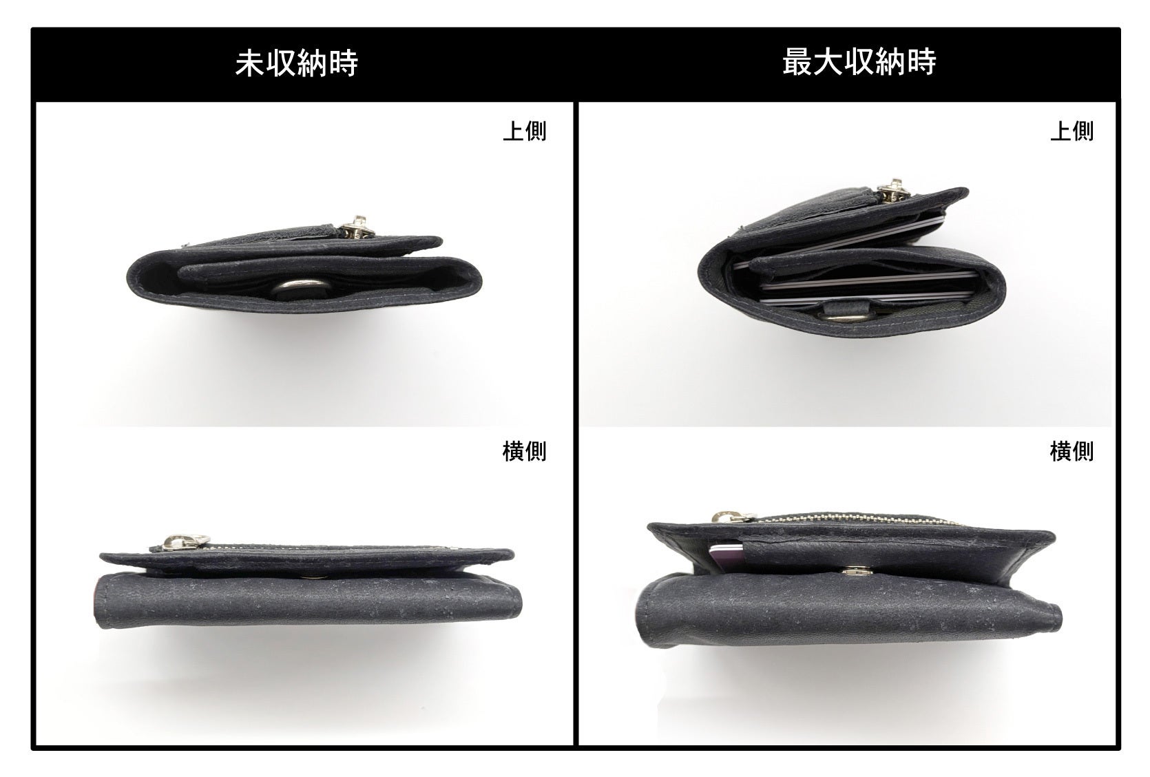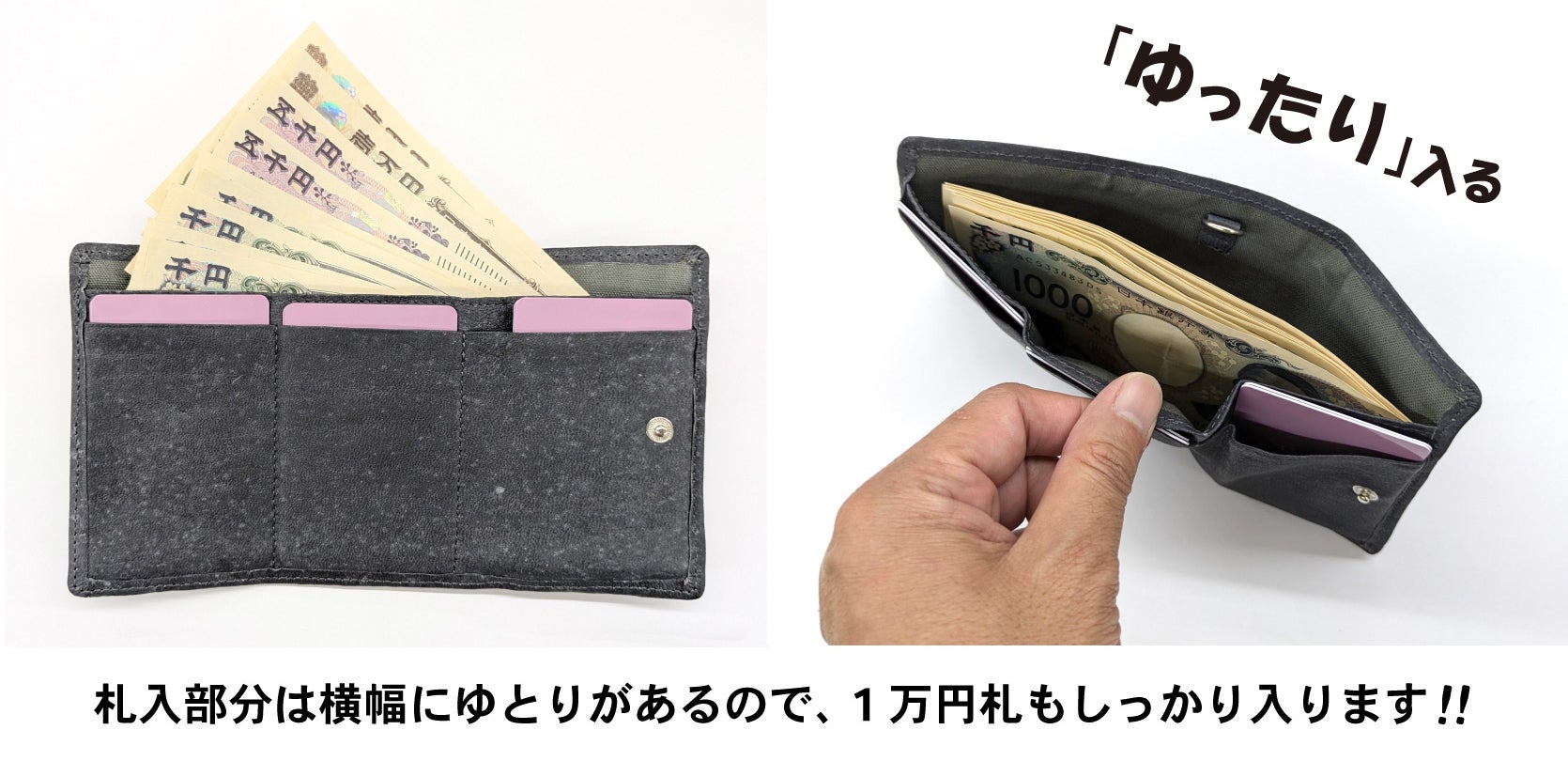 ※上記写真はサイフにお札やカード等を入れた際の厚みの変化を表しています。