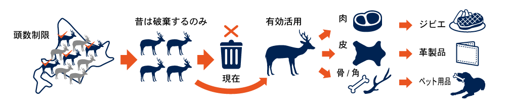 北海道では1998年度以降、エゾ鹿と人間の共生をめざし保護管理計画を策定、GPS等を使用しエゾ鹿の個体数管理等の取組を行っています。近年では狩猟したエゾ鹿を食用として活用する動きが高まっている他、食肉以外にも角や骨は、雑貨やペットフードに、革はバッグや財布等様々な物に作り変えられ利用されています。
