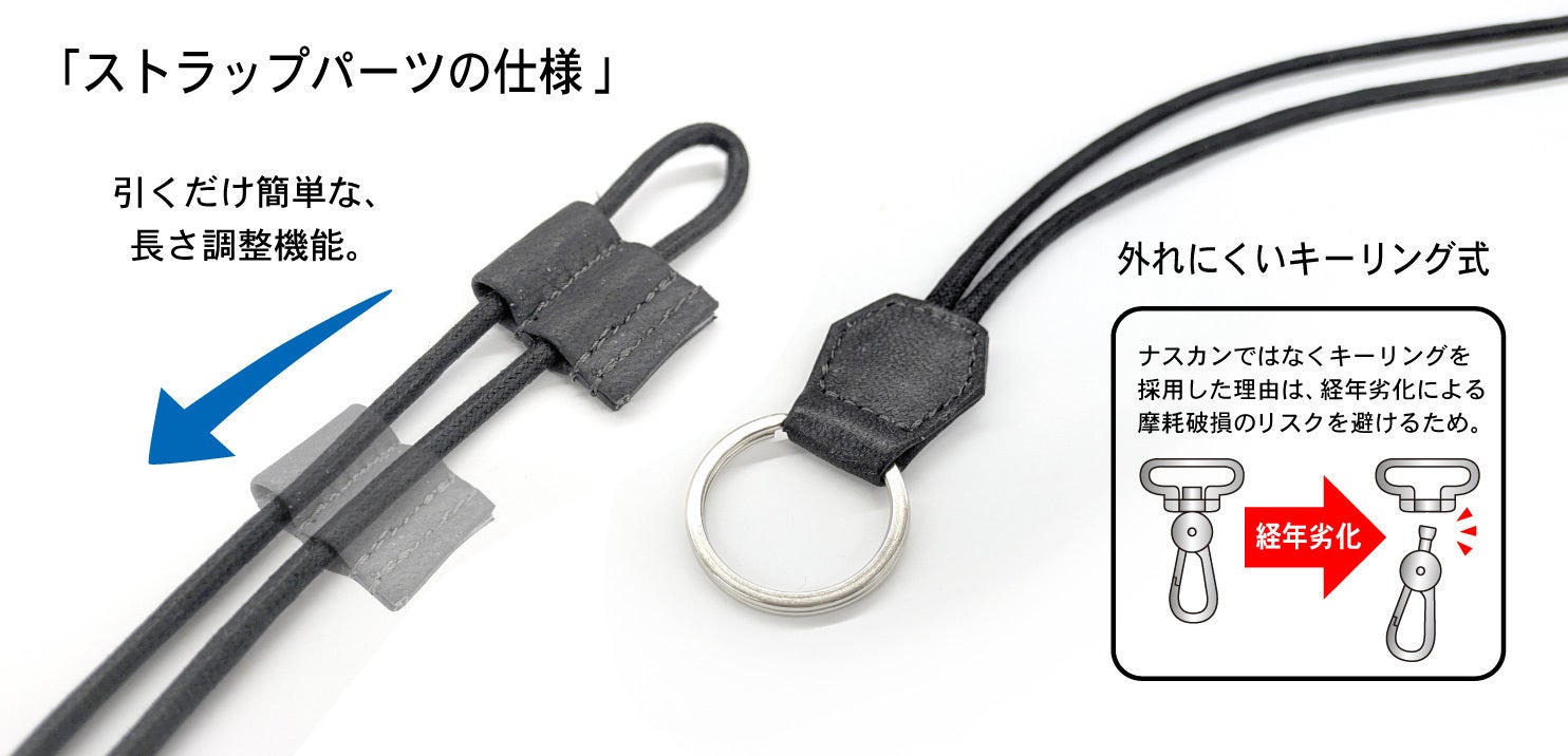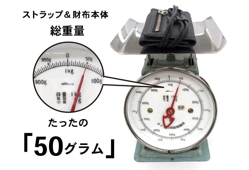 ▲ネックストラップと財布本体を含めた総重量はたったの50g! ※本体のみは40g!