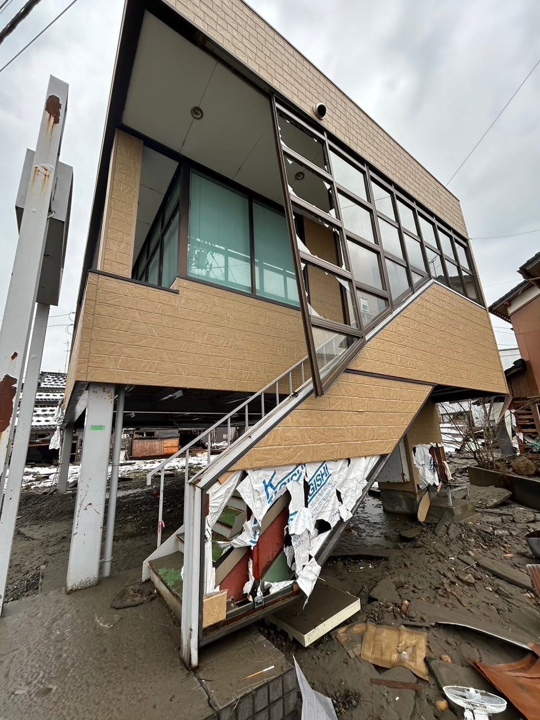 社屋の1階駐車場にあった大切な冷凍庫や倉庫、車両も津波で流され甚大な被害を受けました。