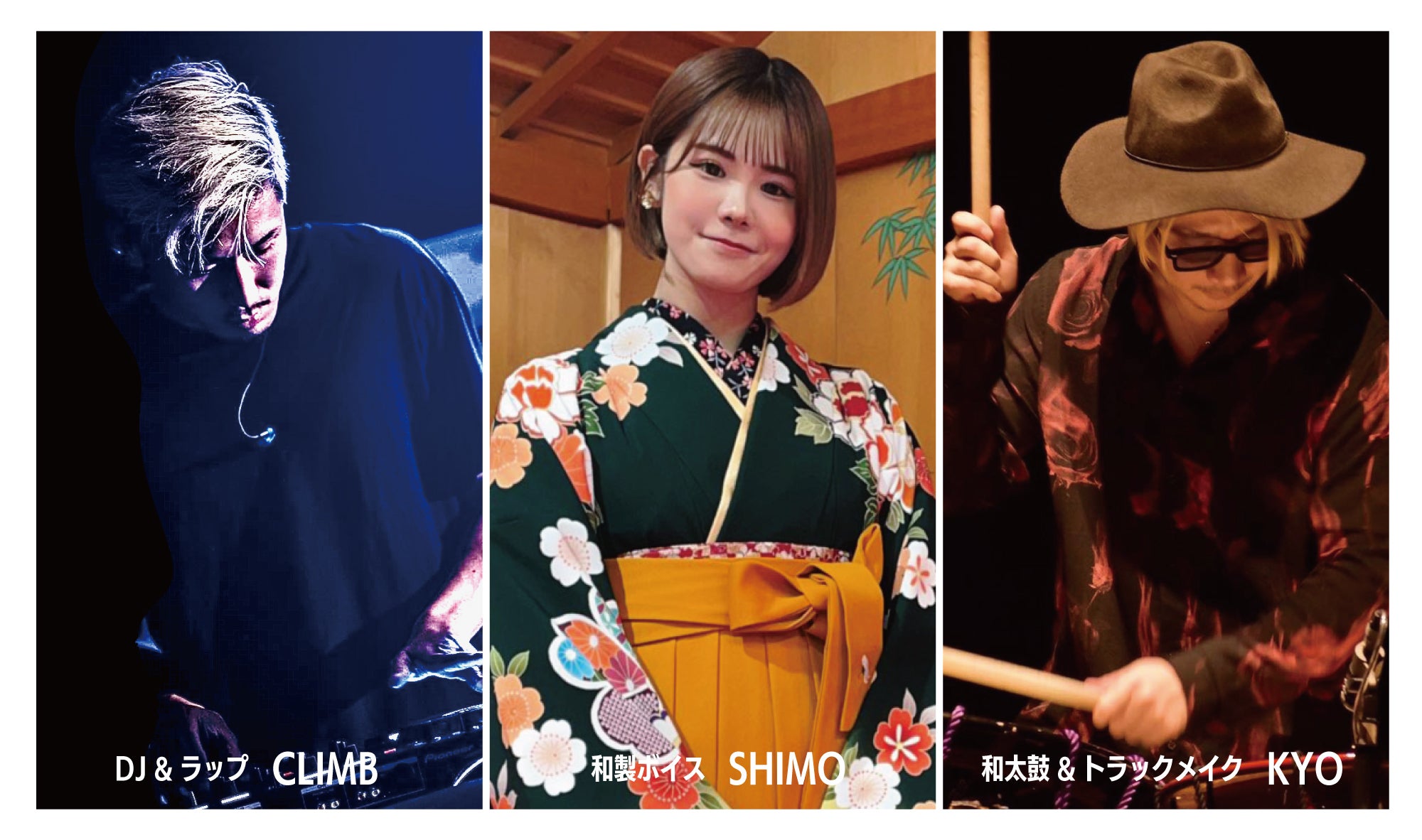 メンバーは、KYO(和太鼓&トラックメイク)、CLIMB(Dj&Rap)、SHIMO(和製Voice)の3人です。