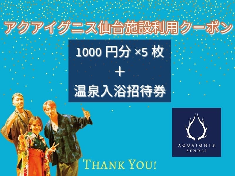 音楽フェス「Future Waves〜未来への波動〜」(※2024年9月21日~)から使用できるアクアイグニス仙台施設利用クーポン5,000円分(1,000円×5枚)と温泉入浴招待券をお渡しします。