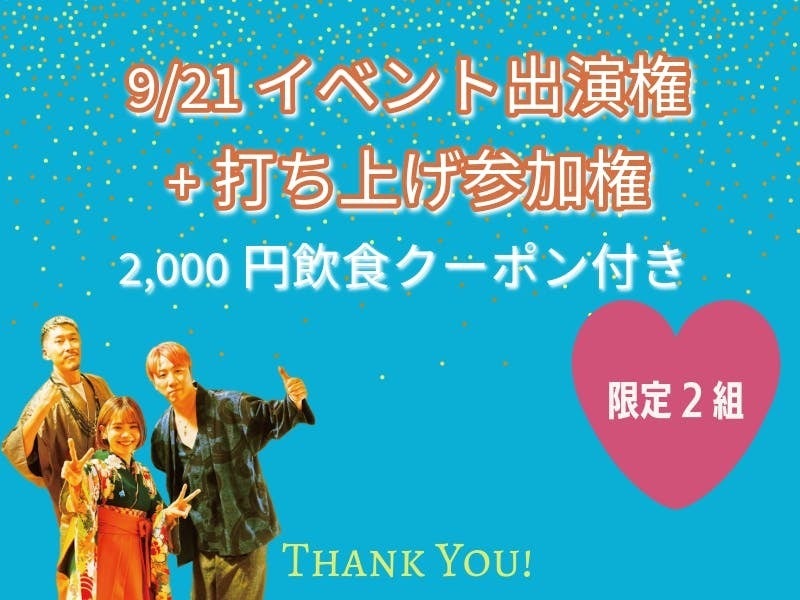 8.9/21 イベント出演権+打ち上げ参加権(2,000円飲食クーポン付き)<10,000円>※イベント出演は限定2組まで