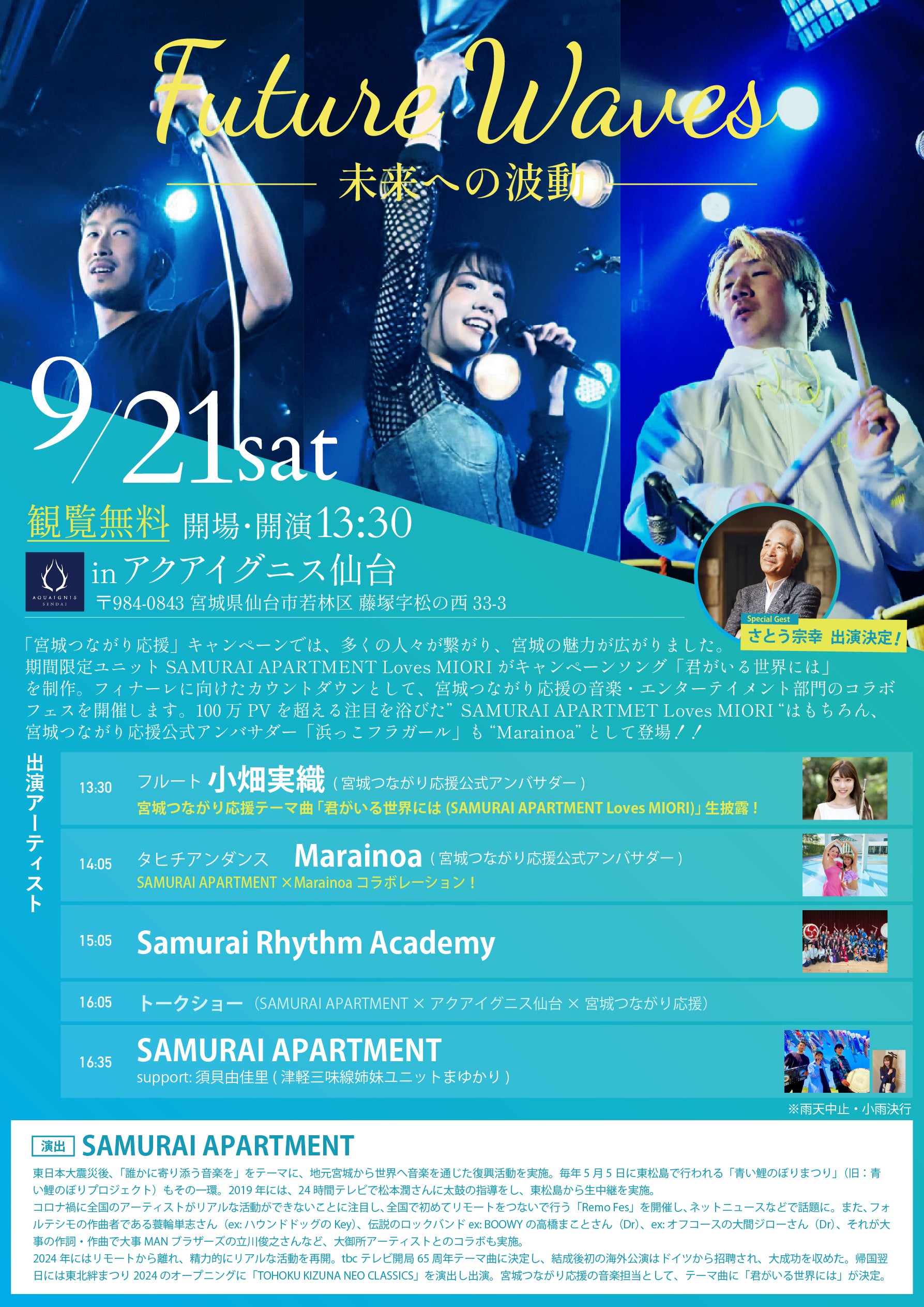 | 14:05- | タヒチアンダンス Marainoa(宮城つながり応援公式アンバサダー)によるSAMURAI APARTMENT×Marainoa コラボレーション |