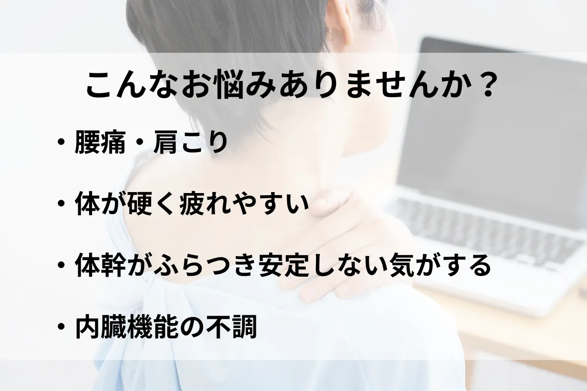 この身体の緊張が、慢性的に持続してしまうと身体の柔軟性を失い、腰痛や肩こり、易疲労性などにつながります。