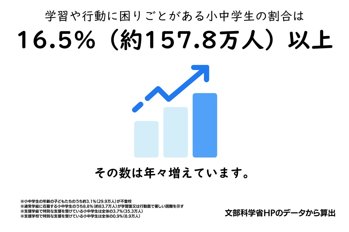 現在の教育/療育環境は「過労死ラインを超える残業をしている先生たち」「子どものため仕事を辞めてお家で子ども支援を行うしかない保護者」「子どもの成長につながる支援を行いたいけれど、自分の無力さを感じている支援員」「心の中ではがんばりたいと思っているけれど、今までの学び方だとがんばれない子ども」などどうしようもない悪循環が残ってしまっています。