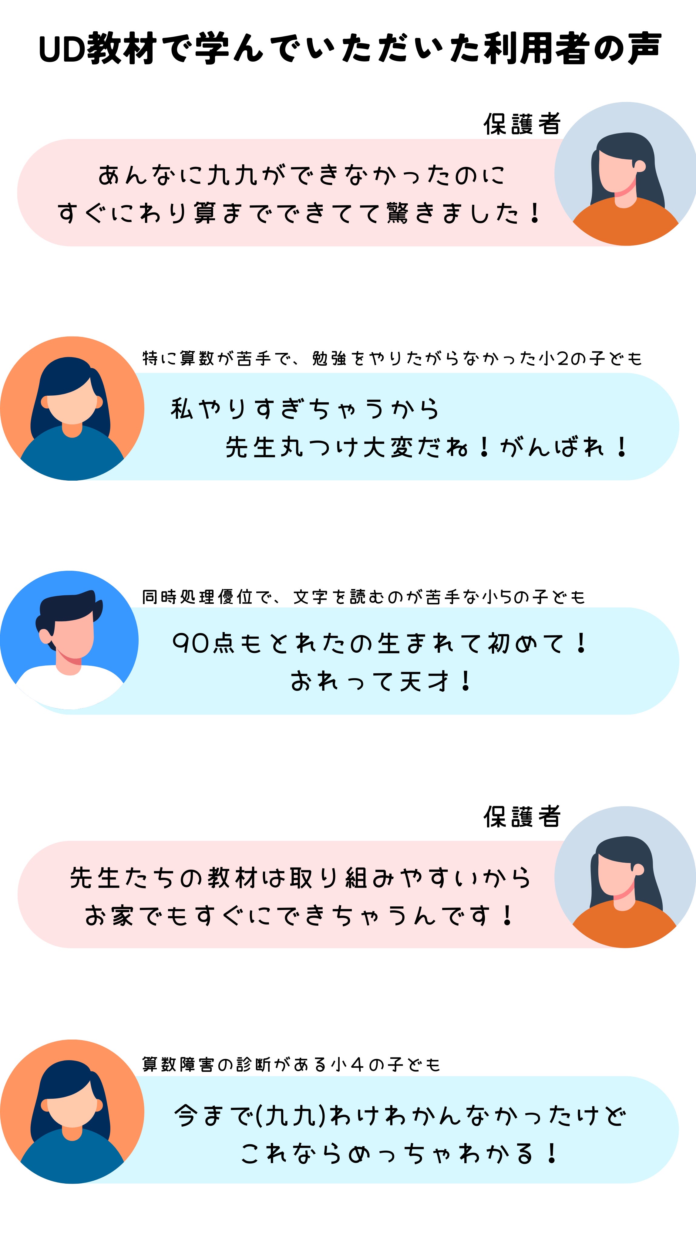 そんな教育/療育環境を変えるため、私たちは教材を制作し続けます。実際にUD教材を使って支援をさせていただいた子どもたちと保護者様からはこんな声をいただきました!