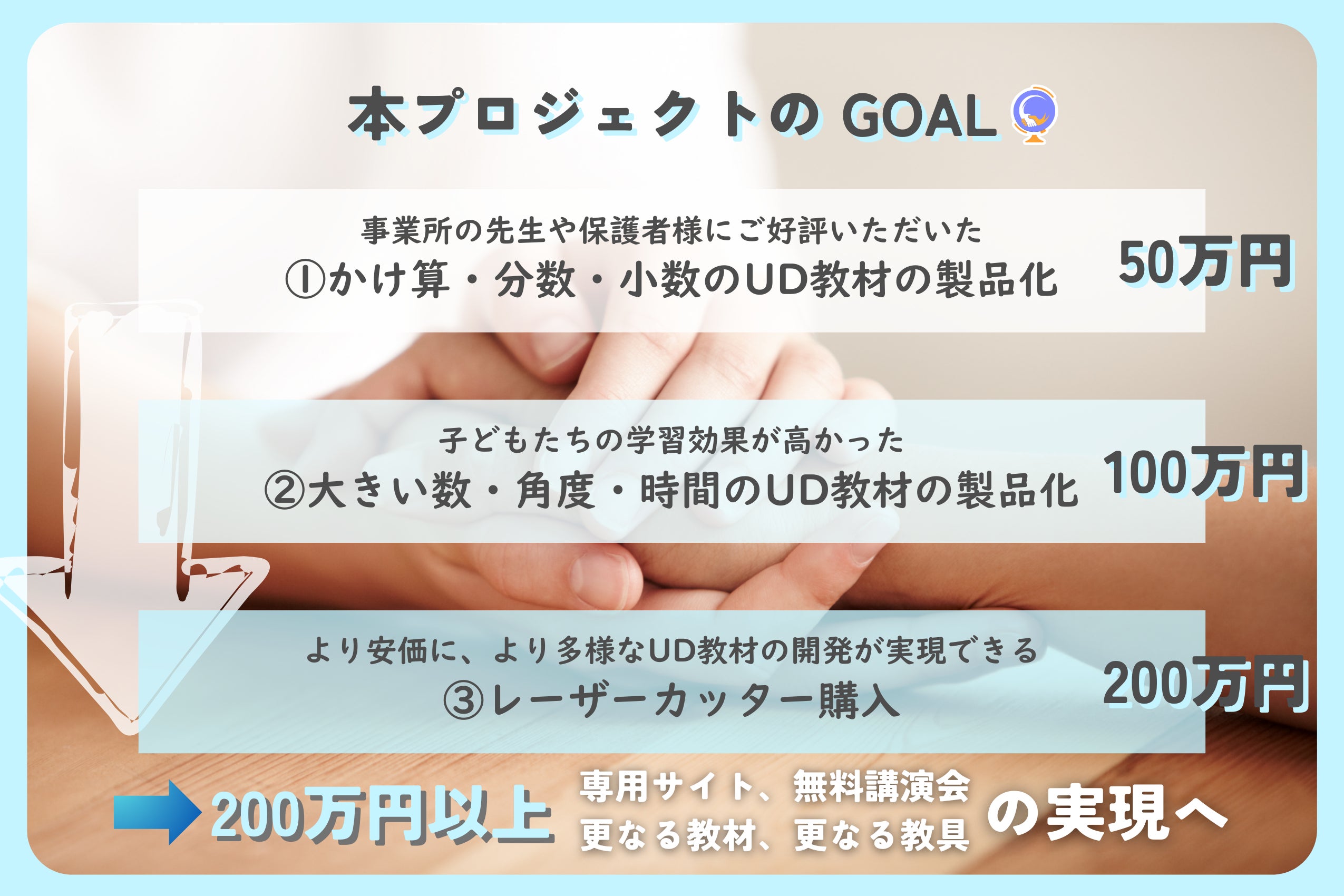 今回はUD教材(算数)の製品化と更なるUD教材のリリースに向けて皆さまのお力を貸していただきたくクラウドファンディングを立ち上げました。