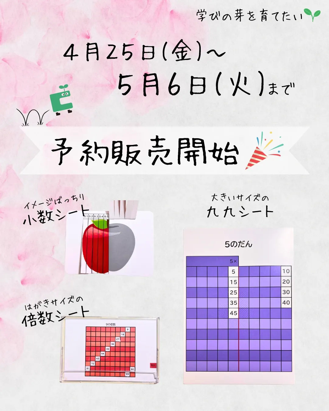 2025/04/25 10:00皆様ご無沙汰しております!UD教育社です!この度、製品化できた教具たちの予約販売を実施する運びとなりました!ご興味ある方がおられましたら、下記サイトよりご注文をお願いいたします。https://puzzorutes.official.ec/予約期間:4月25日~5月6日なお、販売予定数は各300点で、予定数に達し次第販売中止となります。クラウドファンディングで興味をもっていただいた皆様のうち、ご支援を逃してしまった皆様ににおかれましては、この機会にご注文をいただけますと幸いです。【製品詳細】①小数シート■内容物・横切り:りんご / 1円玉 / 黄色い四角・縦切り:りんご / パン / 黄色い四角・仕様書兼ミニドリル※1冊/全10ページ■販売予定数:300点■使い方動画:https://youtu.be/R3GHRE52clM②九九シート■内容物数字表 / 九九シート(2の段・3の段・4の段・5の段・6の段・7の段・8の段・9の段) / 仕様書兼ミニドリル■販売予定数:300点■使い方動画:https://youtu.be/Vqc7rLknhGw③かけ算・公倍数シート■内容物数字表 / 倍数シート(2、3、4、5、6、7、8、9の倍数) / 収納ケース / 仕様書兼ミニドリル※全18ページ■販売予定数:300点■使い方動画:https://youtu.be/a3LVGrAvcvo【使い方動画一覧】 もっと見る製品化完了しました!(支援者の皆様へ)