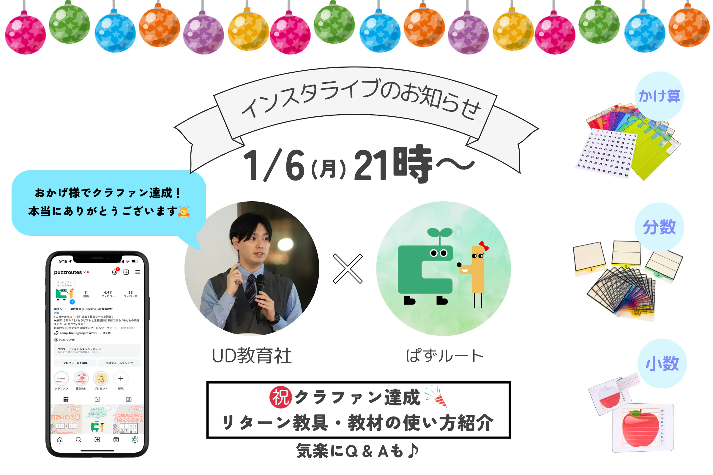 そこで今回、ぱずルートのInstagramのアカウントより1月6日(月)21時~インスタライブを開催し、ざっくばらんに「教具の使い方」から「気楽にQ&A」を実施します!https://www.instagram.com/puzzroutes/