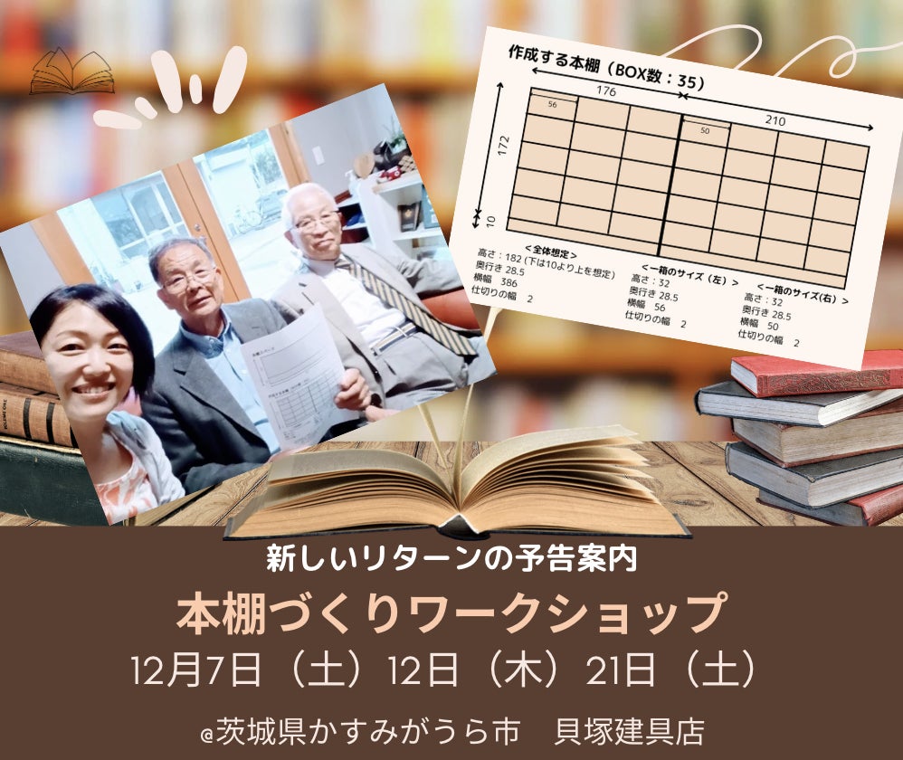 本日は、コミュニティカフェTAKiBiBAに設置する本棚づくりを指導してくださる、貝塚建具店(かすみがうら市)の貝塚社長と本棚づくりに向けて、打ち合わせをしてきました。当初、かすみがうら市の間伐材を使って本棚を作成予定でしたが、まだ丸太の状態のため、今から製材すると最適な状態になるまで時間がかかるようで、1月頃を予定しているコミュニティカフェオープンには間に合わないことが判明。。。。う〜〜ん、どうしようか。。。となっていたところに、その場にいらっしゃった草刈り木工株式会社の草刈会長が既に最適な状態の茨城県産の杉の材を、「どうぞ使ってください。」とご提供くださることに!!本当にありがとうございます。本棚づくりのワークショップを新しいリターンとして追加予定です。【本棚づくりワークショップ参加チケット】開催予定日:12月7日(土)、12日(木)、21日(土)時間はいずれも9時〜17時 *参加できる日程、参加できる時間だけのご参加でも大丈夫です。開催場所:貝塚建具店(茨城県かすみがうら市)金額:10,000円詳細はリターン公開時にあらためてご案内させていただきます。キャンプファイヤーの審査が通り次第、まもなく公開させていただきます。作った本棚は一箱ずつオーナーを募り、本を販売したり貸し出したり、自由にオーナーの想いの表現の小さな舞台として使っていただく予定です!私も一箱オーナーになる予定で、今から本のセレクトを楽しんでいます。一箱オーナーは既にリターンとしてご用意していますので、こちらもぜひ^ ^コミュニティカフェTAKiBiBAあっちゃん(伊原淳子)