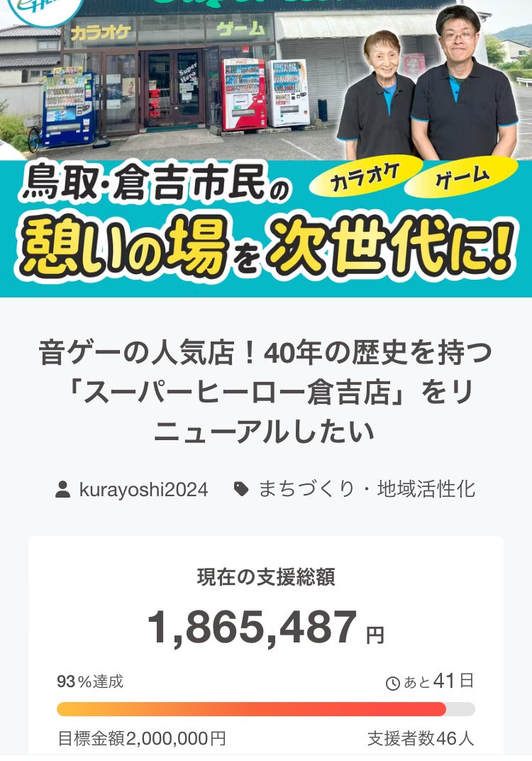 クラファン終了しました!Finalゴールには届かなかったものの、延べ183人の方から3,905,572円のご支援を頂戴しました。本当にありがとうございます。ゲーム機の購入や店舗のリニューアルのために大切に使わせていただきます。どのようなリニューアル内容になるかはよく協議して、随時お知らせいたします。各種リターンにつきましても、ご案内して参りますのでお待ちください。うっかりしてて支援できなかった!こんなクラファンやってたんだ!?という方もいらっしゃるかと思いますが、今日も元気に営業していますので、ぜひ遊びに来てください!これからは日々の売上が大事なご支援となりますので、楽しく遊んでいただけるお店作りに努めて参ります。今回のクラファンを通じて、多くの方からお店を頑張って続けて欲しいとお声掛けいただきました。いろいろと苦労しながらお店を残してこれて良かったと実感できました。本当にありがとうございました!