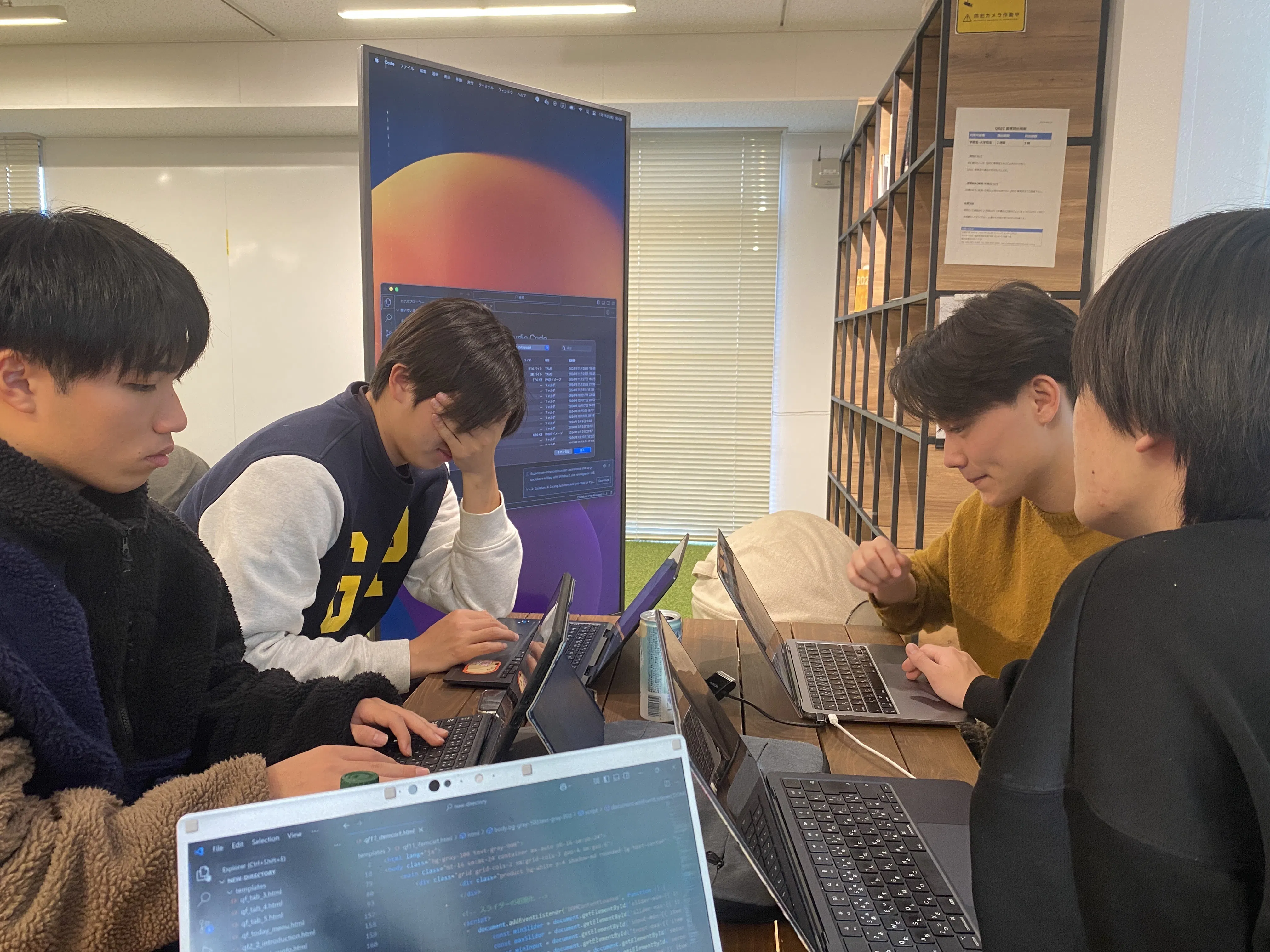 (開発を進めている様子です。大学の24時間空いているスペースを使って、時には徹夜で開発にいそしんでいます。)