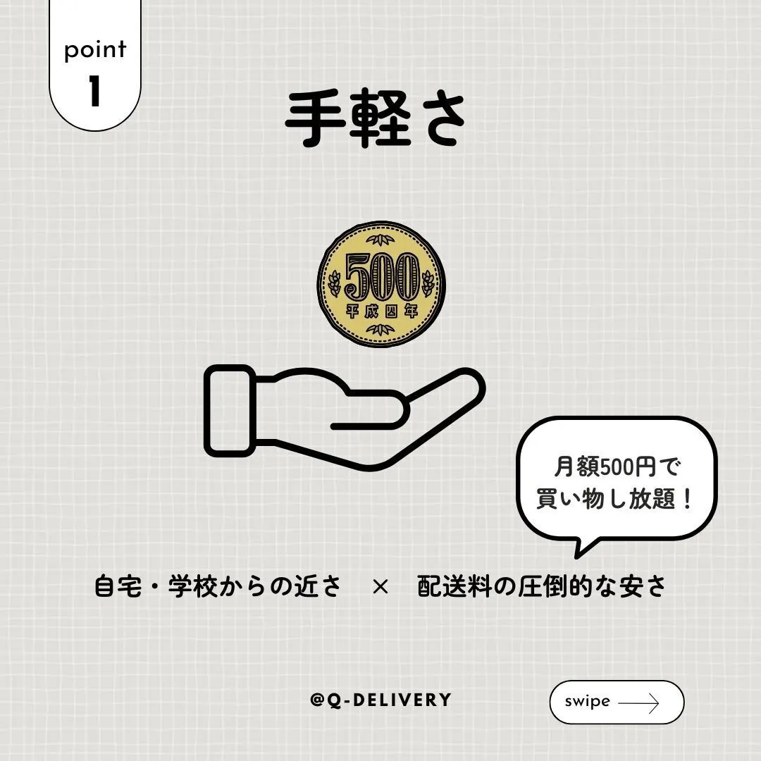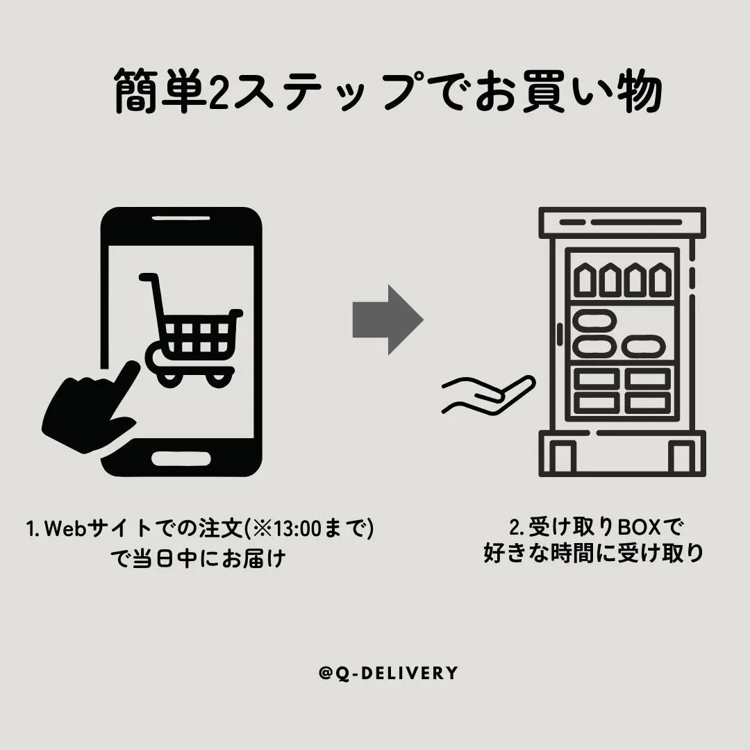Q-DELIVERYではスマホがあればいつでも商品を購入することが可能です。また商品の受け取りはキャンパス周辺に設置する受け取りボックスでの受け取りになるため時間を気にする必要がありません。(1人暮らしの大学生は自宅で商品を受け取れる時間が限られてしまいます。)