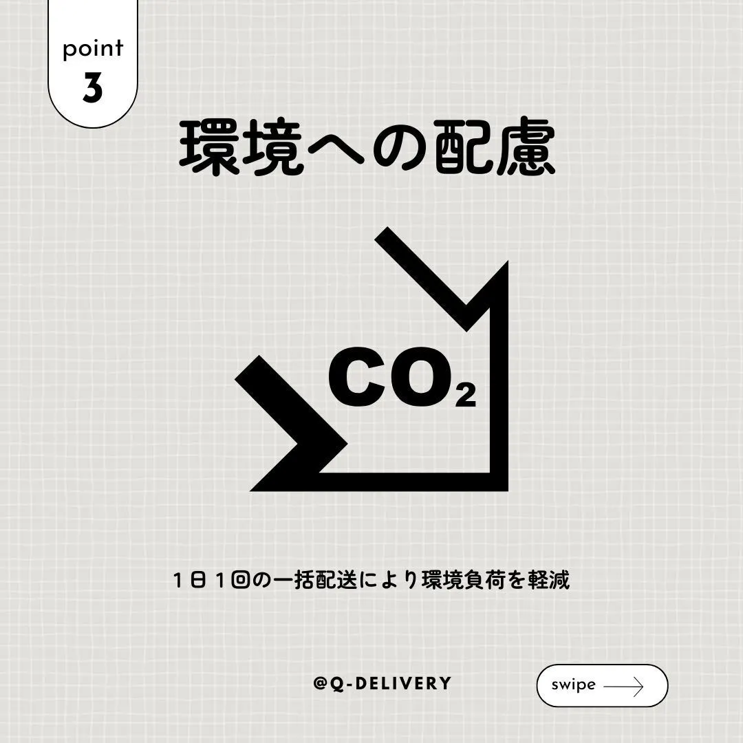 Q-DELIVERYは運送事業用の軽自動車を使用し1日1回一括で、数百人分の食料品を配送するサービスです。従来のバイクを使用した配送サービスや個々人が自家用車やバイクを使って買い物に行くライフスタイルに比べに二酸化炭素の排出量を削減することができます。近隣の交通渋滞も少しは減るかもしれません。