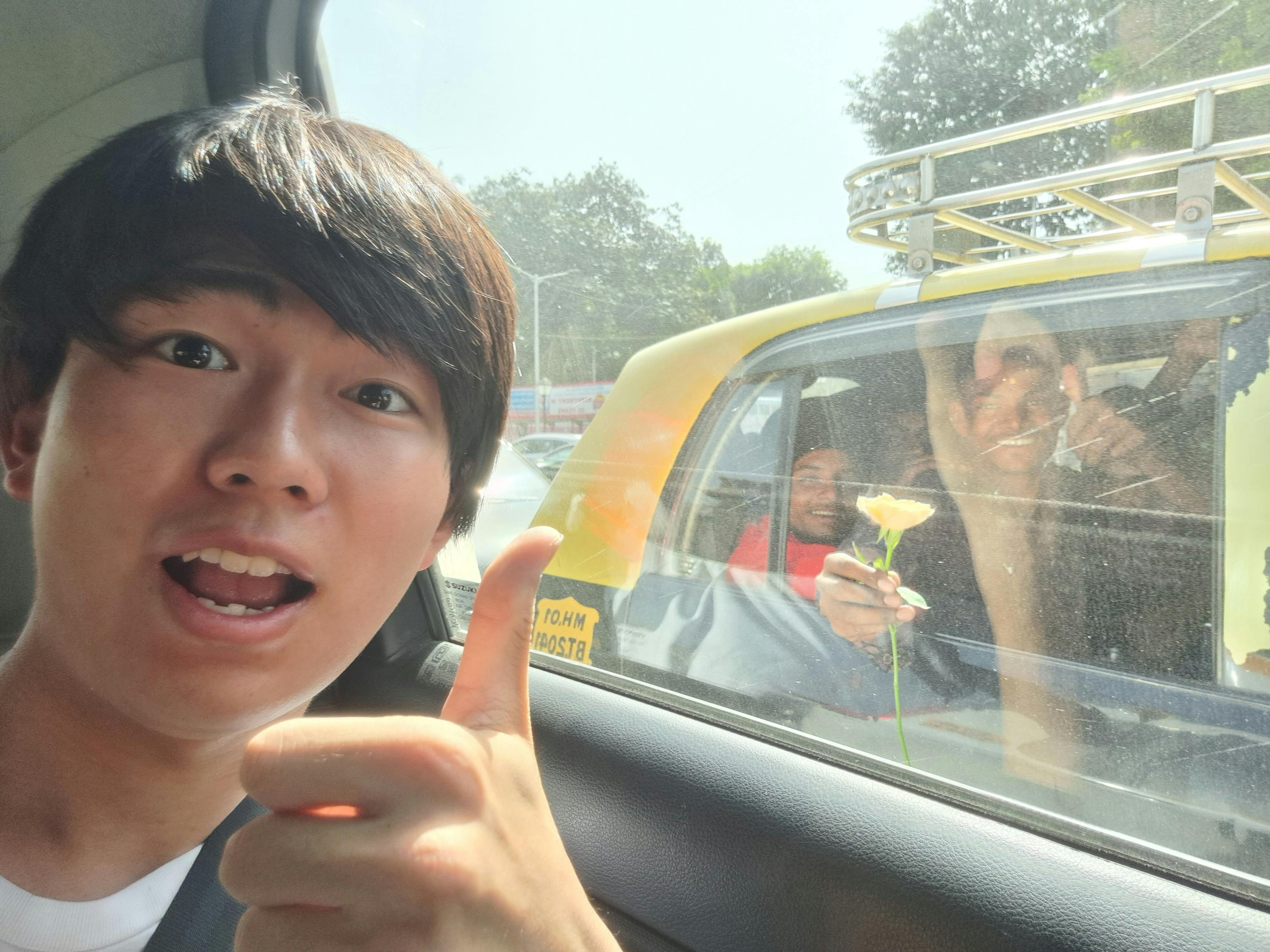 (車越しに花をくれたインドの青年達と)