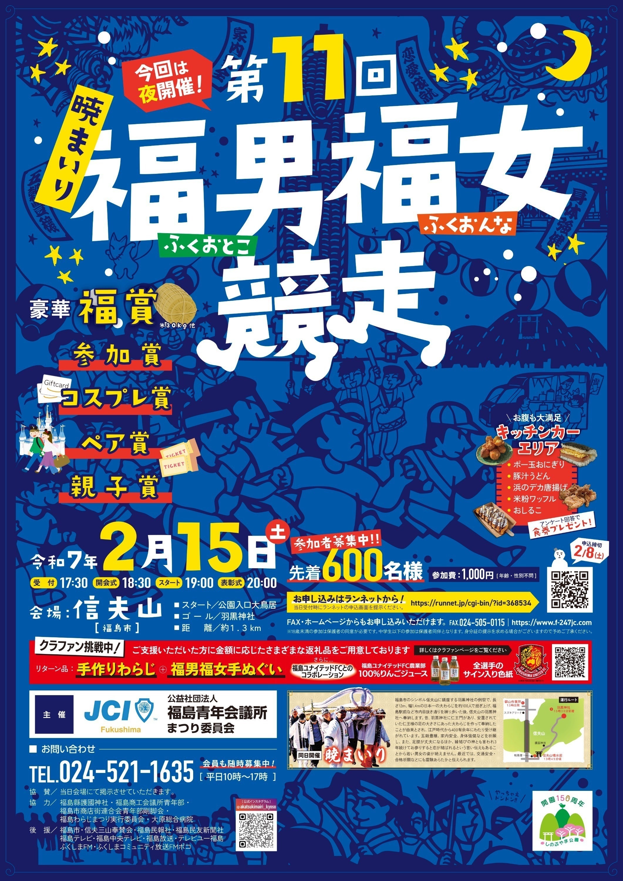 公益社団法人福島青年会議所まつり委員会にて、第11回福島福女競走を主催させていただきます。我々は夏に開催される「福島わらじまつり」の原点である冬開催の「暁まいり」を盛り上げ地域発展を目指しております。目的のために、神事の趣のままに同日夜に競走を開催し賑わいを創出すべく数か月かけて事業準備しております。どうぞご支援宜しくお願い申し上げます。