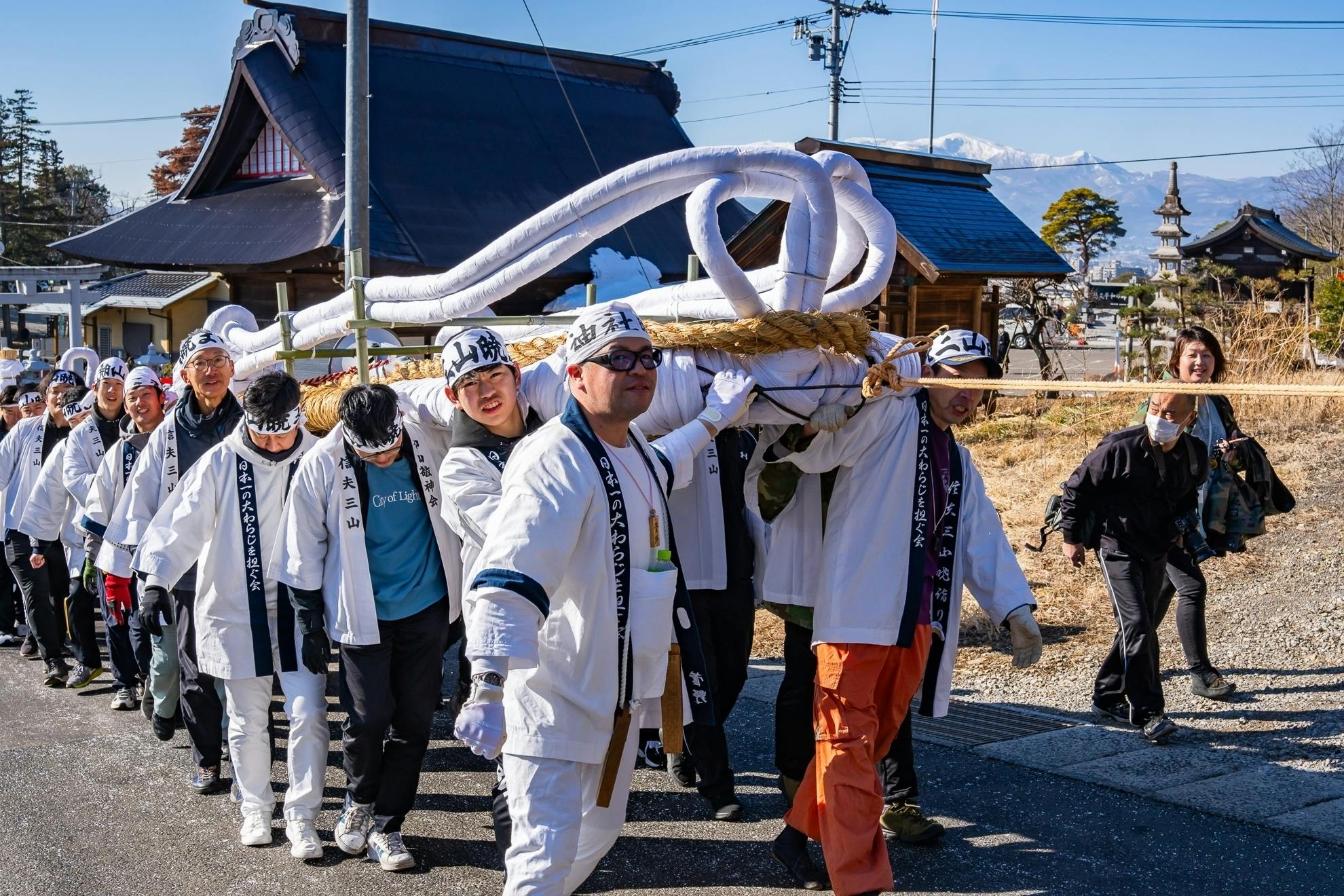 福島市のシンボル信夫山に鎮座する羽黒神社の例祭で、長さ12m、幅1.4mの日本一の大わらじを約100人で担ぎ上げ、福島駅前など市内目抜き通りを練り歩いた後、信夫山の羽黒神社へ奉納します。昔、羽黒神社に仁王門があり、安置されていた仁王様の足の大きさにあった大わらじを作って奉納したことが由来とされ、江戸時代から400有余年にわたり受け継がれています。
