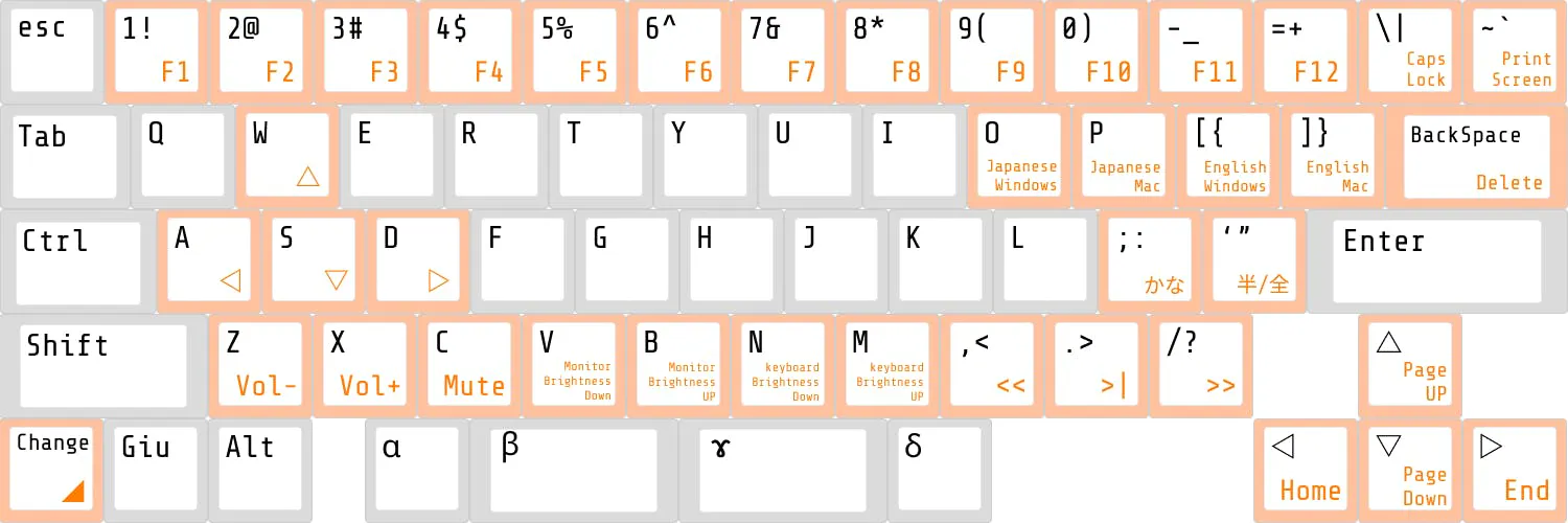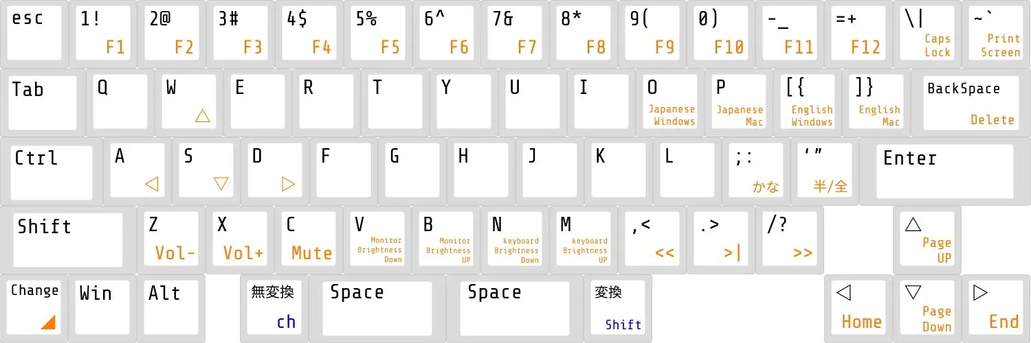 Fキーは左下にあるチェンジキーを長押しすることでオレンジ色の部分のキーは変化します。キー配列を変更する場合もチェンジキーから変更します。よく使うと思われるボリューム、モニター光量、キーボード光量、再生ストップ機能を最下段にキャプスロックにプリントスクリーン、Home、End、PageUP、PageDownとりわけAWSDが十字キーに変化する部分はタッチタイプの利便性を高めます。