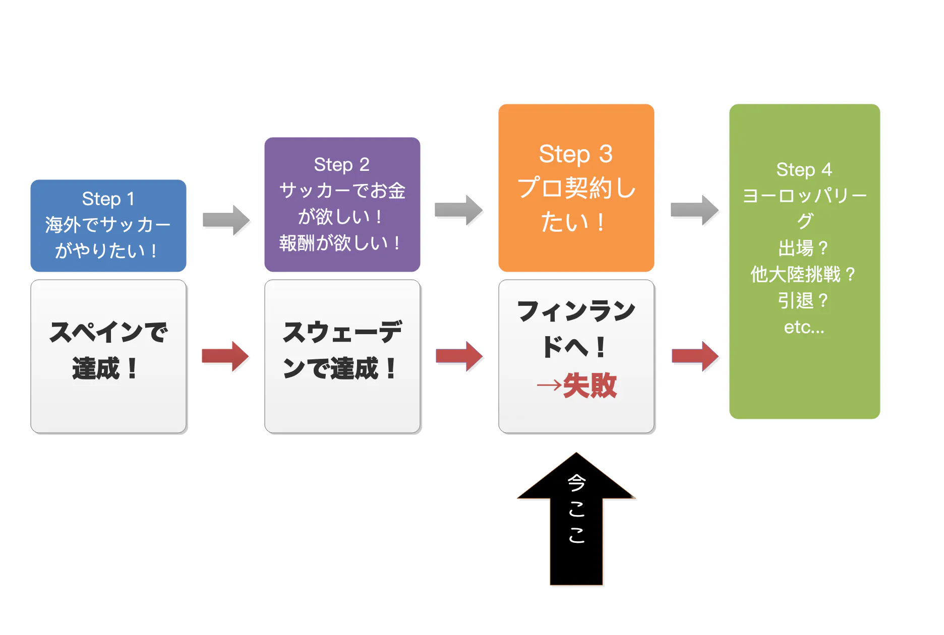 上の図が今後のサッカーの目標と僕の現在地です。