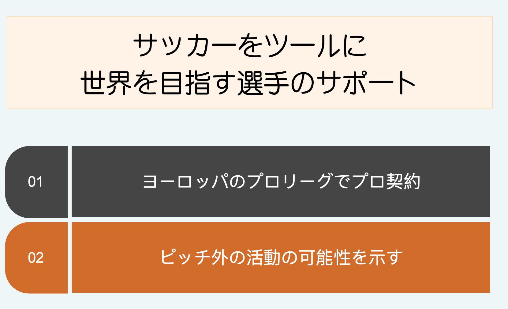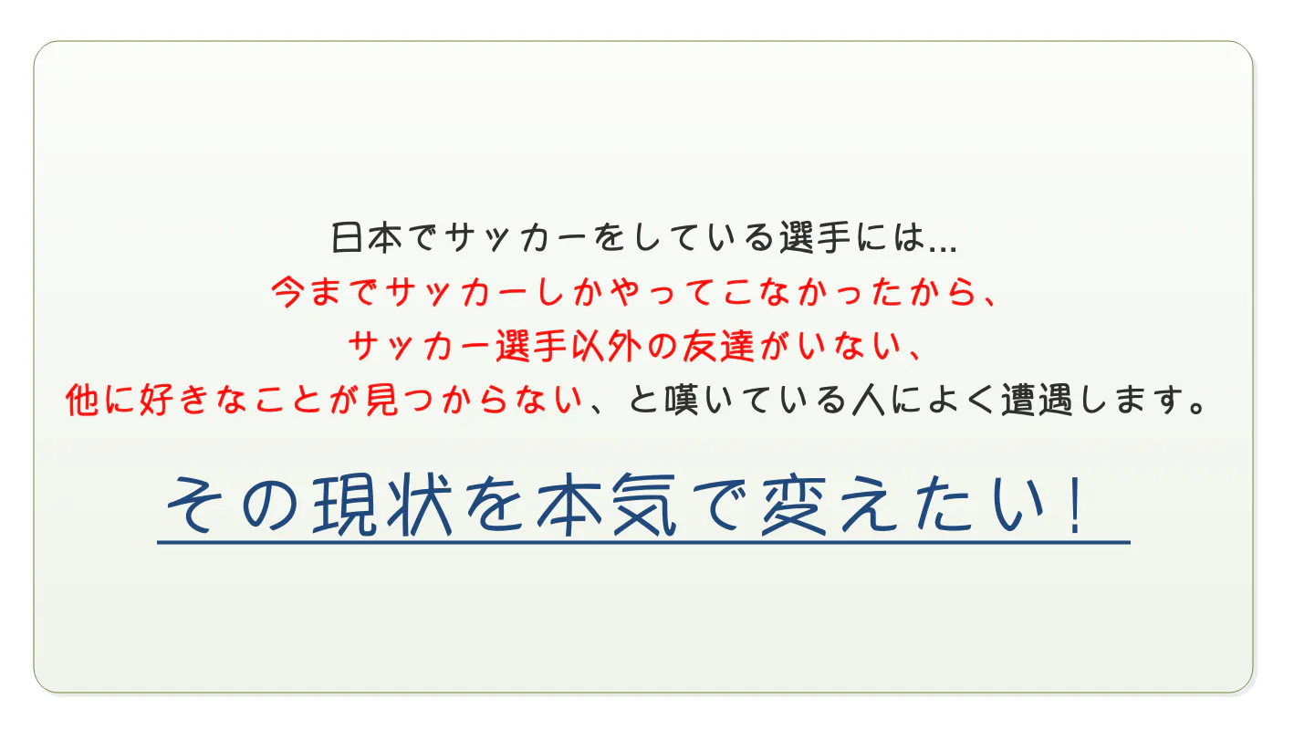 例えばをこれを見た選手がこのプロジェクトを参考にし、オリジナルを加えて実行するようになれば「サッカーをツールに世界に出ていく選手」が増えていくことは間違いありません。
