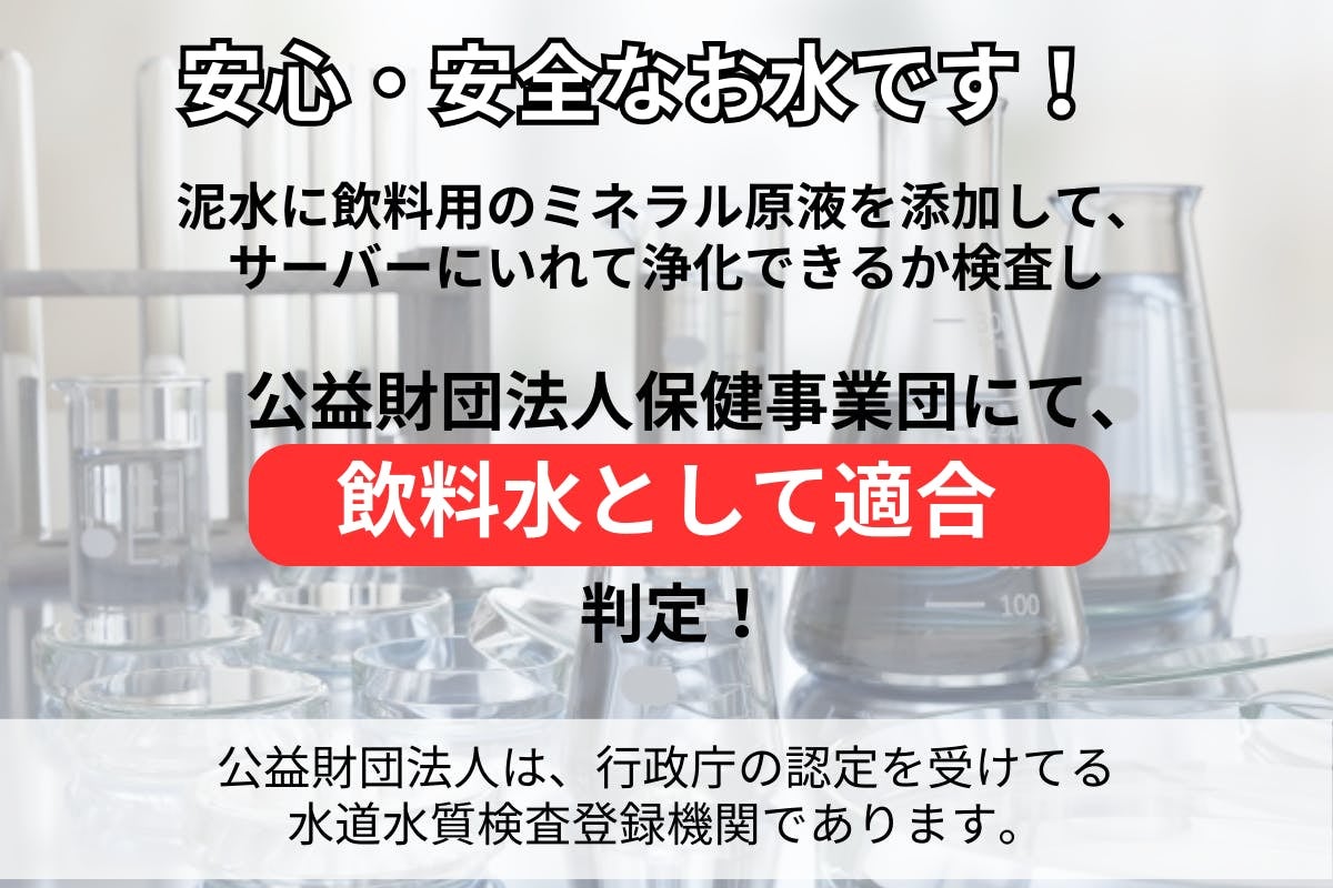 - 行政庁から水道水質検査に認定を受けている公益財団法人保健事業団にて、検査いただき「飲料水として適合」の判定がとれている安全なお水になります。