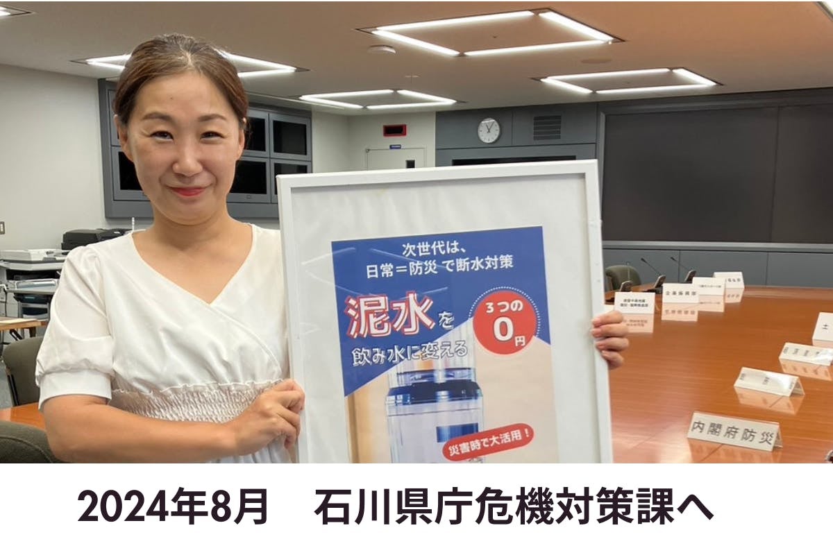 石川県庁の危機対策課へ、1月の能登半島地震以降の被災地で活用いただいてる現状をご報告にいってまいりました。能登半島地震後、長期の断水期間、電動ウォーターサーバーは活用できず、2025年以降、石川県の防災は大きく変わるなか「水インフラ」は大きなウエートを占めるそうです。まさに災害に強い水インフラ整備が重要になってきます。