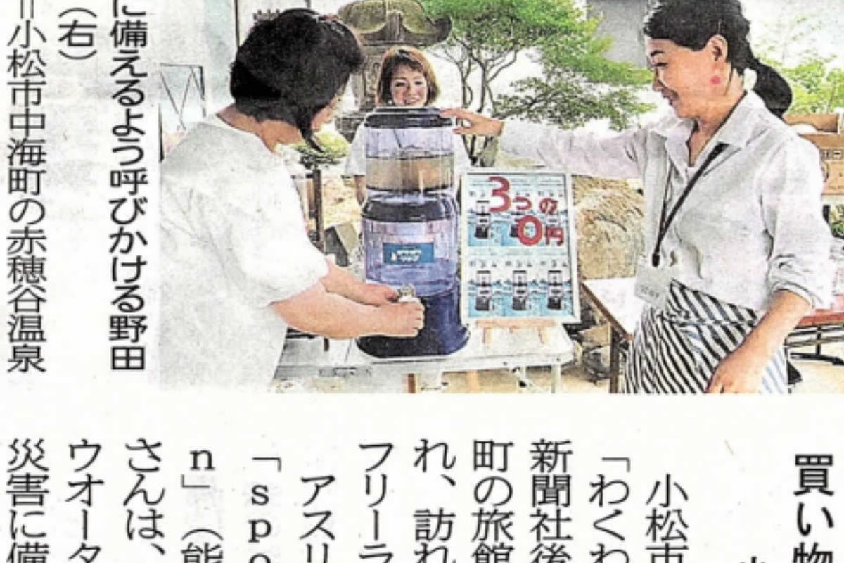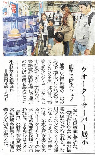 - 2024年10月20日(日)能美市防災フェスタにて、災害・断水時は泥水など自然水をろ過して飲み水に変える断水対策として次世代ウォーターサーバーをご紹介させていただき市民の皆様に大好評いただきました。