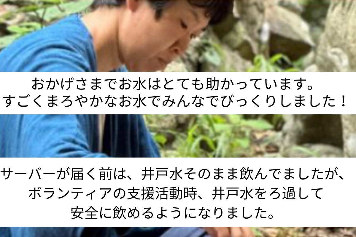 - 今回のリターン内容につきましては、【能登復興を応援】コースについて、支援者様には一律お礼のメッセージを【断水対策」コースについてはお名前をWEB掲載させていただき、【地域創生】コースについては、支援者様がウォーターサーバーの設置を指定頂きますことをご了承ください。