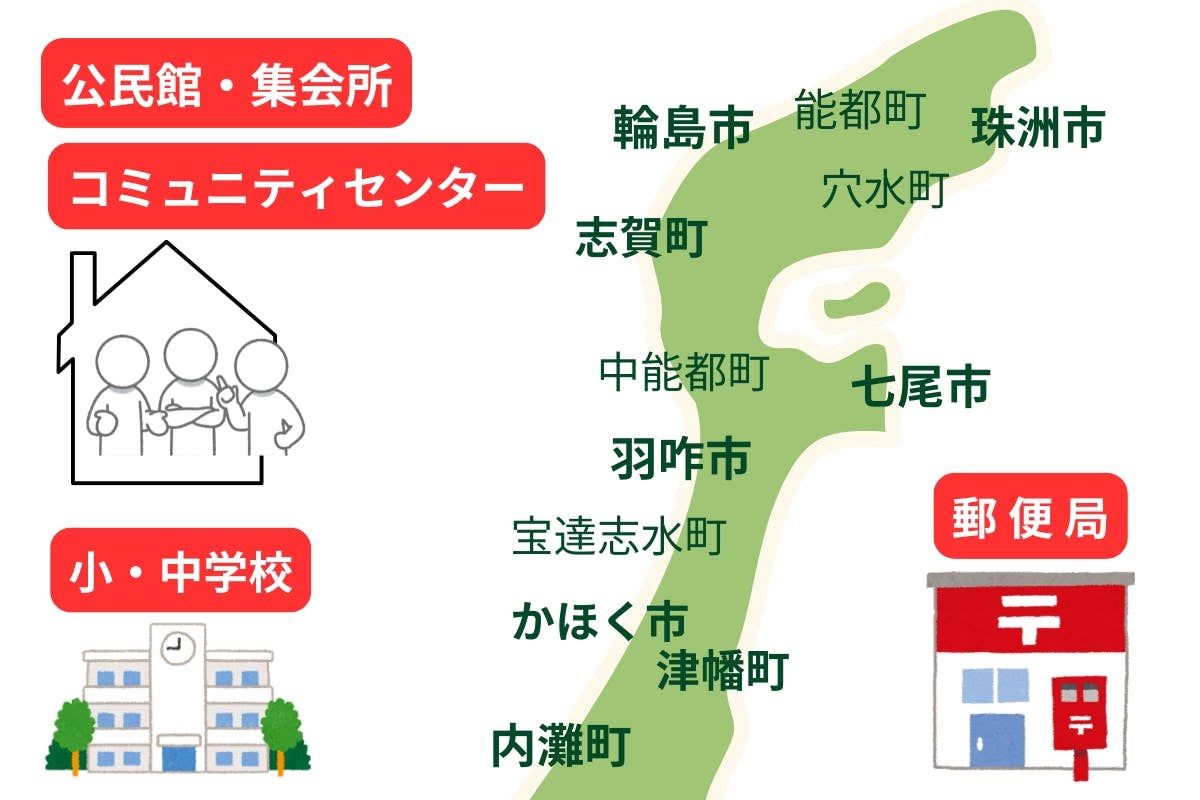 能登地域の市区町村の公民館や集会所、コミュニティセンター、小中学校、郵便局以外でも