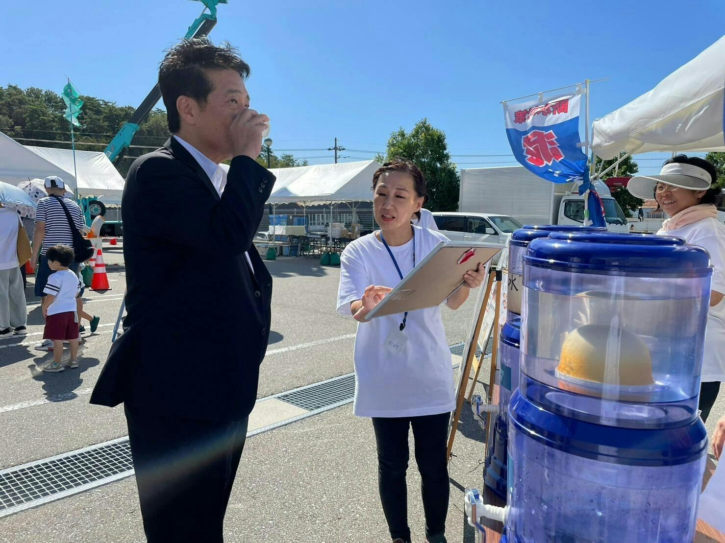 - 2023年9月24日能美市防災フェスタでは、井出敏朗能美市長をはじめ、多くの来場者に泥水でろ過したお水を試飲していただきました!
