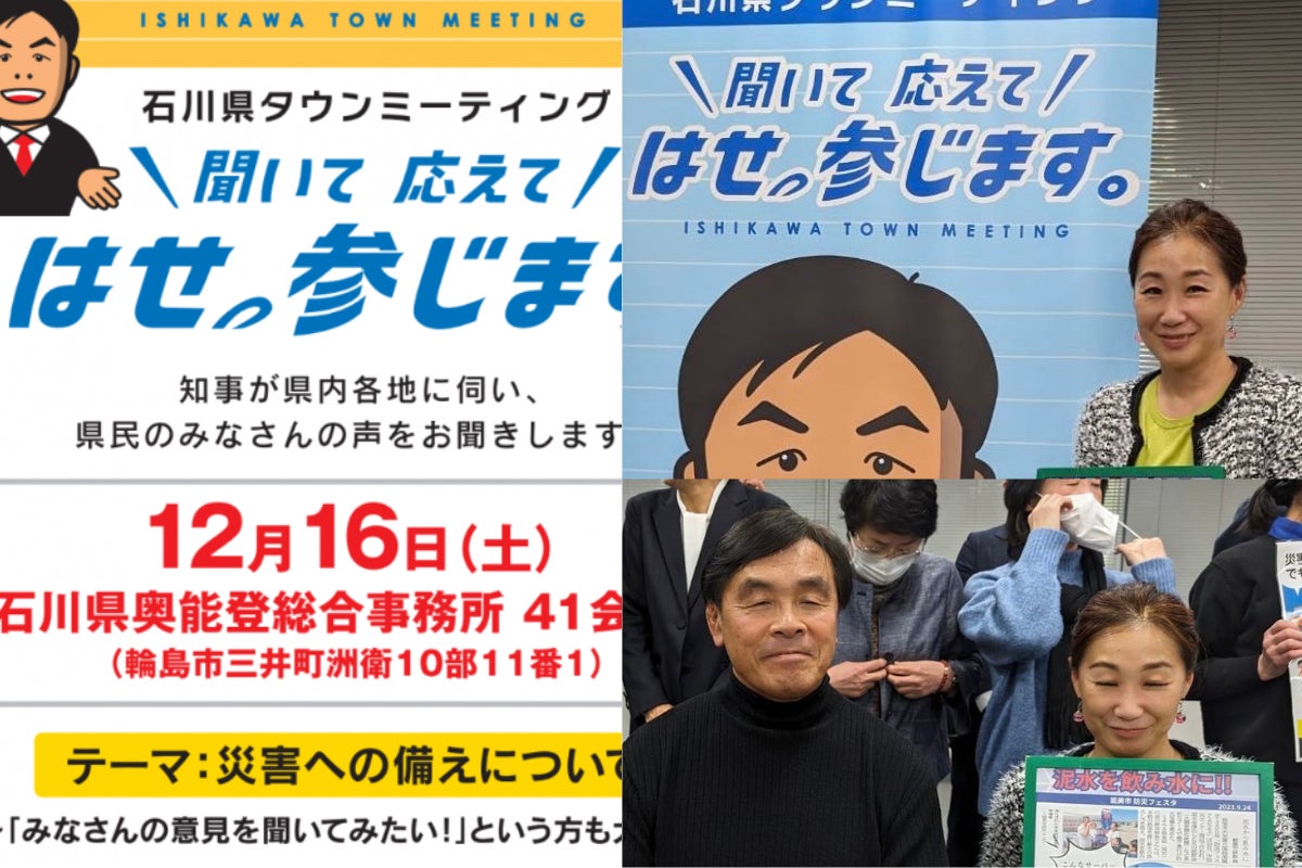 2023年12月16日、奥能登総合事務所で開催された「災害への備え」をテーマにした馳知事のタウンミーティングに参加させていただき、近年県内で起こった各地の断水時に飲み水を確保することができた皆様方のお声をとどけさせていただきました。